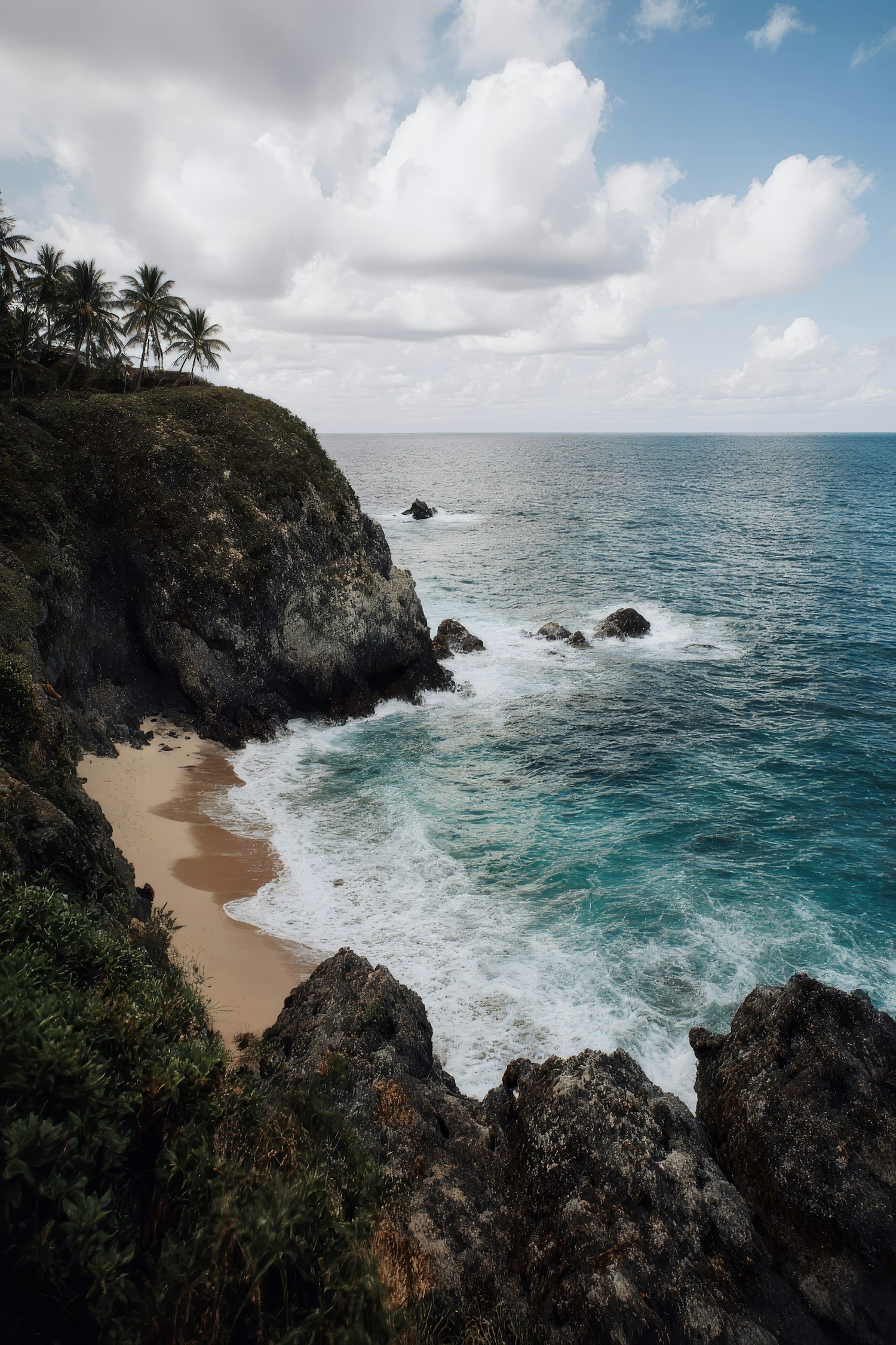 A stunning coastal scene with cliffs, palm trees, a sandy beach, and turquoise waves under a partly cloudy sky.
