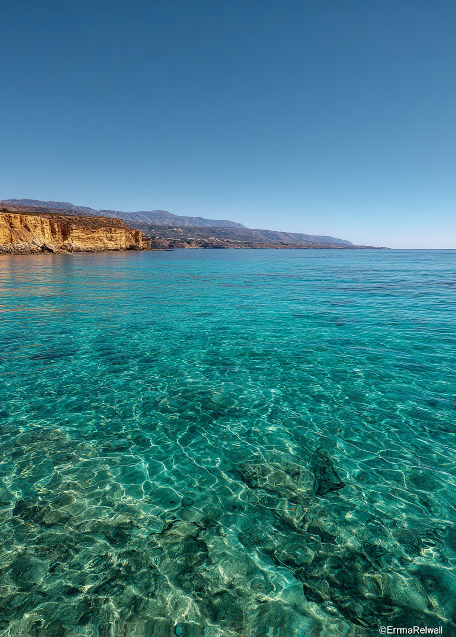 Crystal-clear turquoise waters meet rugged golden cliffs under a vibrant blue sky, creating a serene coastal paradise.