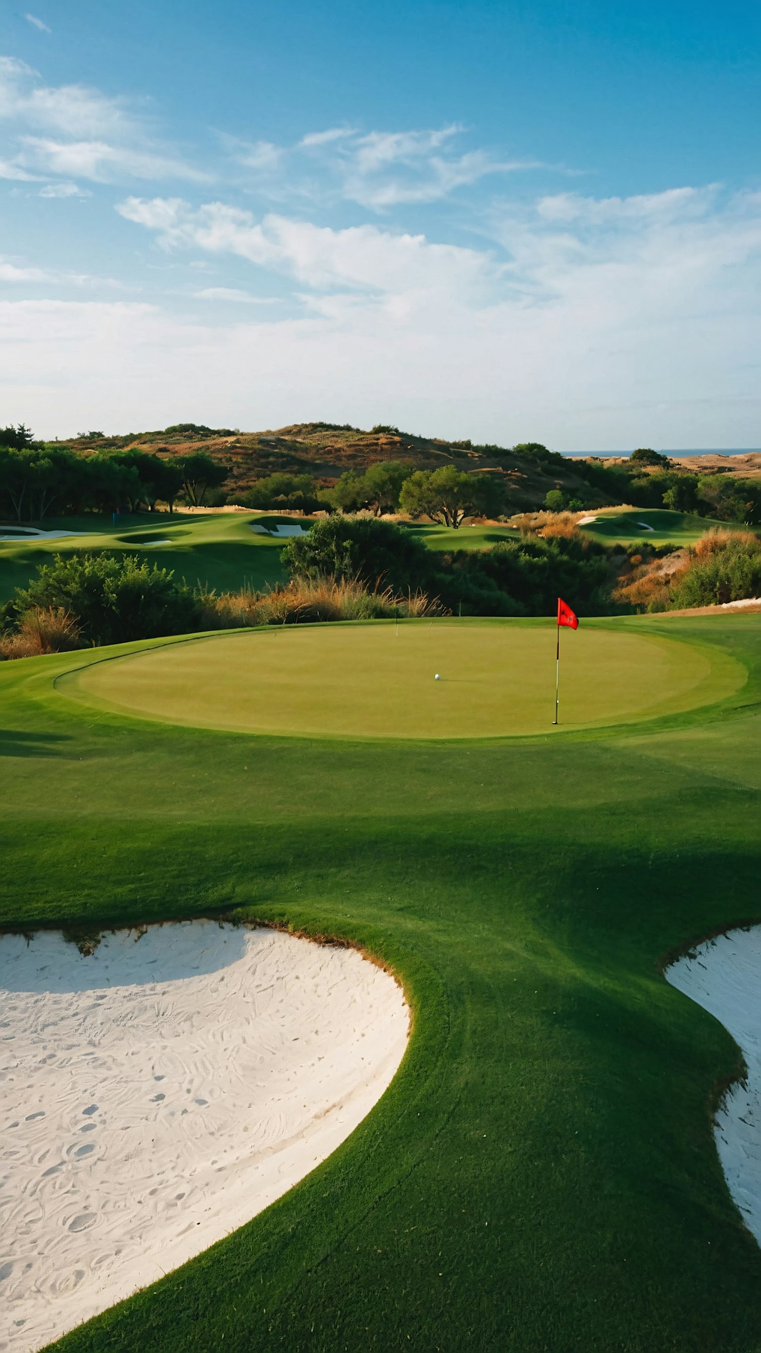 Beautiful golf course with a pristine green, red flag, sand bunkers, and scenic rolling hills under a clear blue sky.