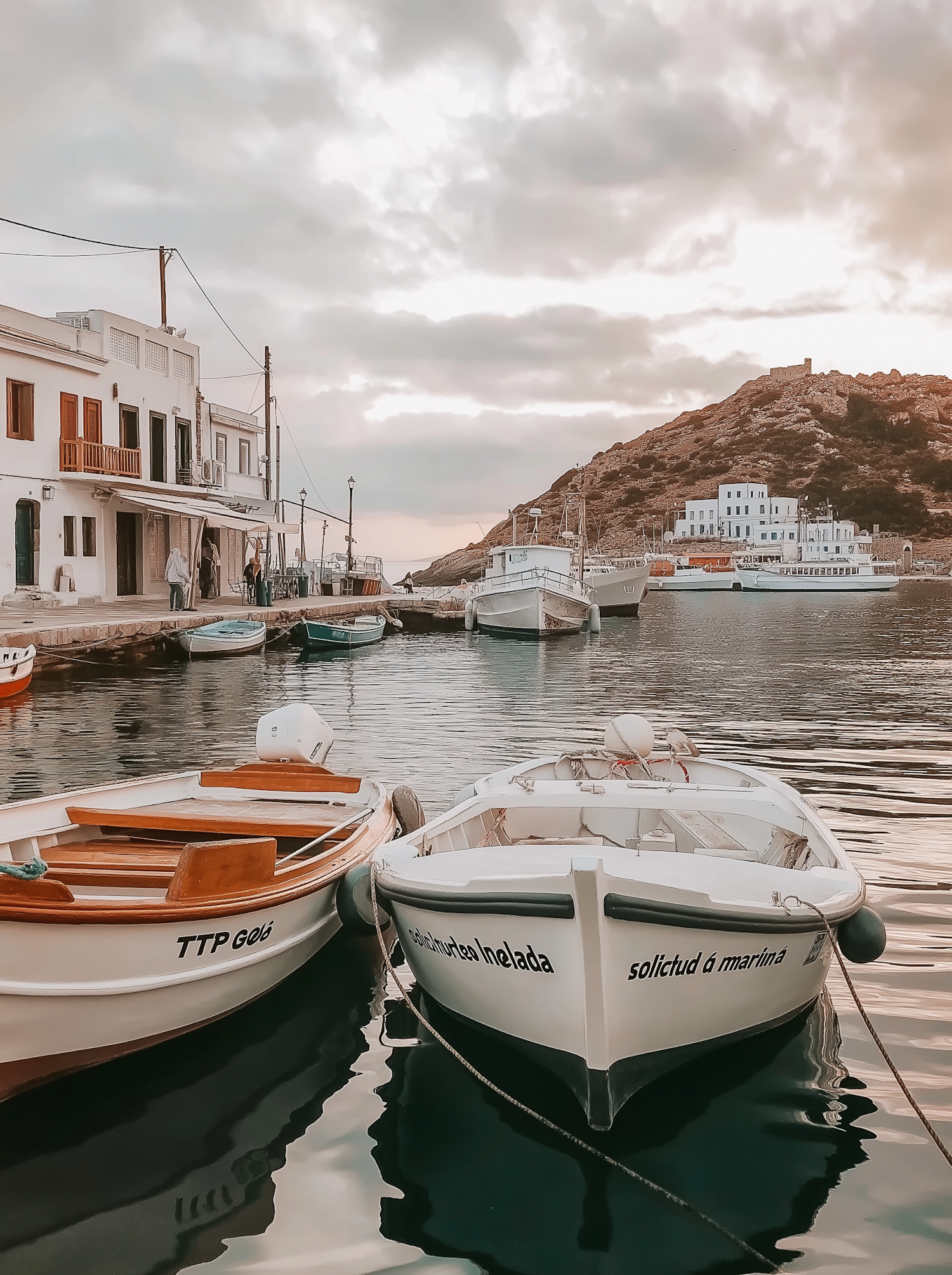 Serene harbor scene with boats, white buildings, and a rugged hill under a soft, cloudy sky. Tranquil Mediterranean ambiance.