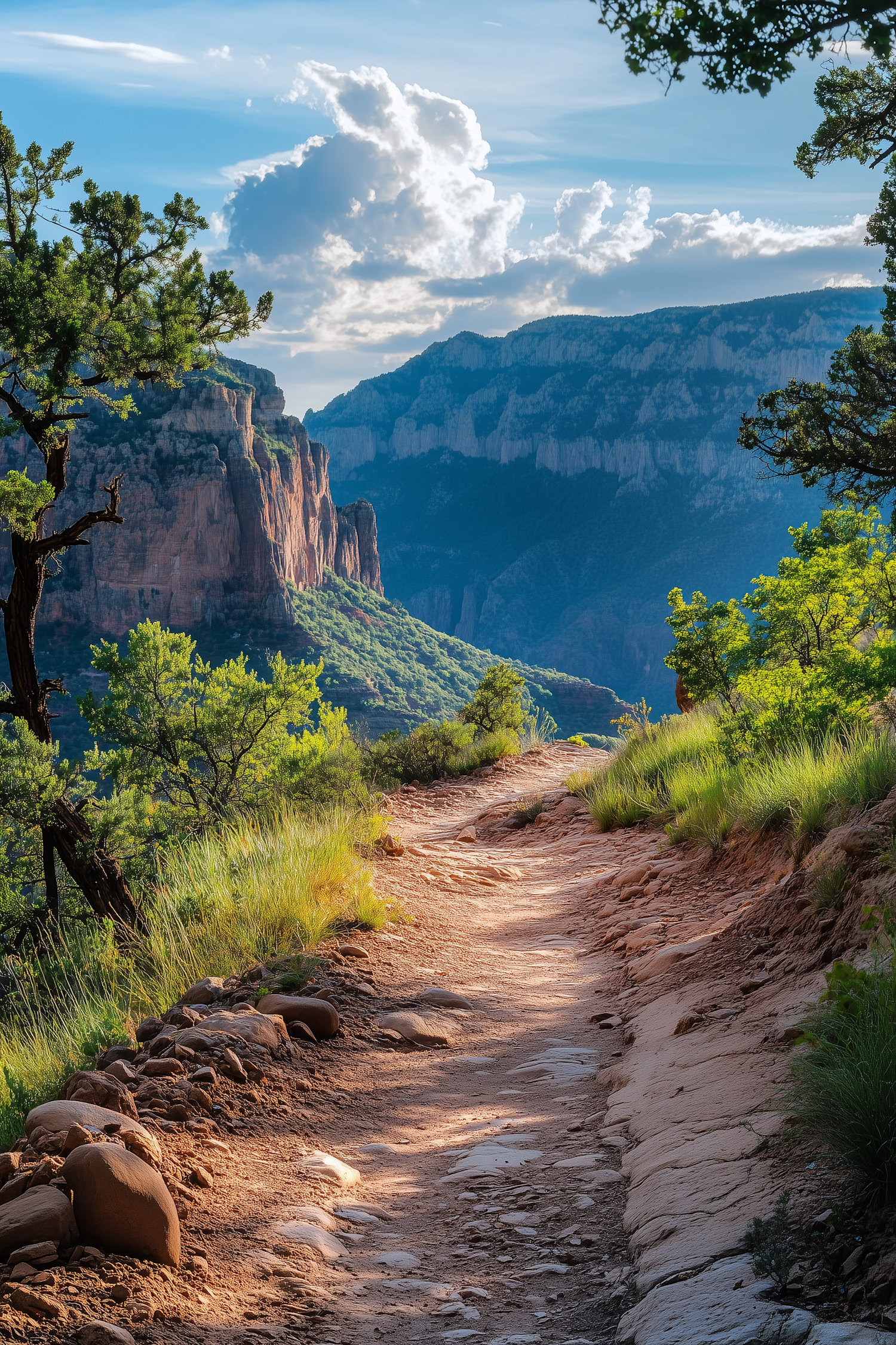 Scenic dirt path leading to sunlit cliffs and mountains, framed by lush greenery and a bright blue sky with fluffy clouds.