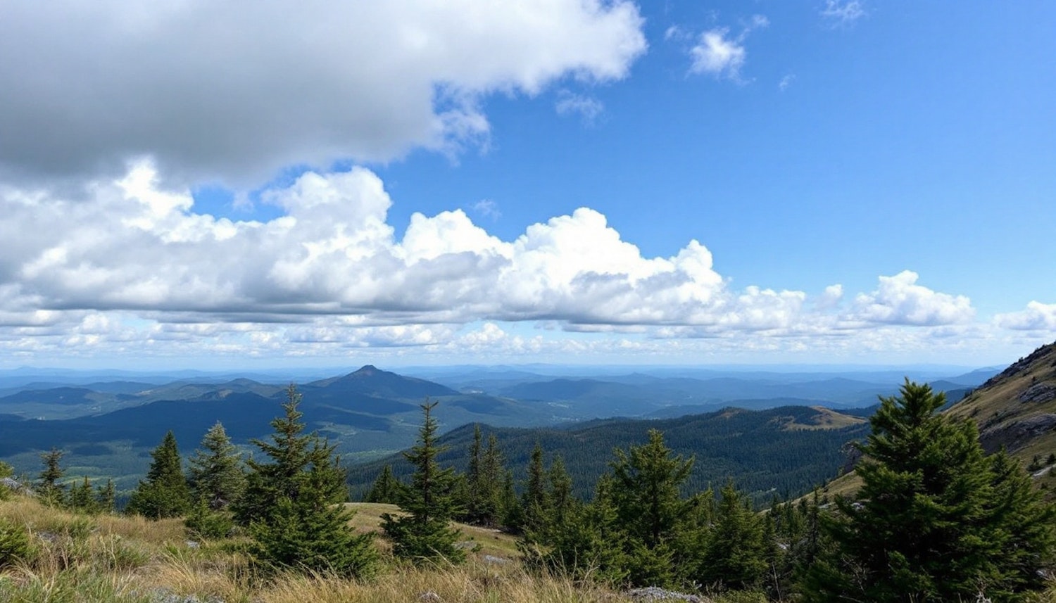Majestic mountain landscape with lush green pines, blue sky, and fluffy clouds, offering a serene and breathtaking view.