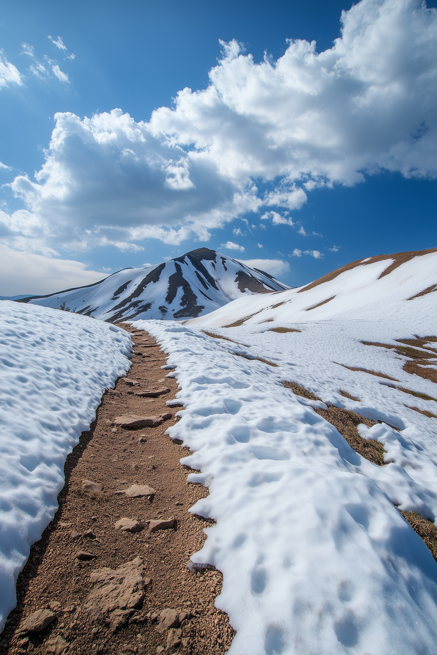 A dirt path winds through melting snow towards a snow-capped mountain under a bright blue sky with fluffy clouds.