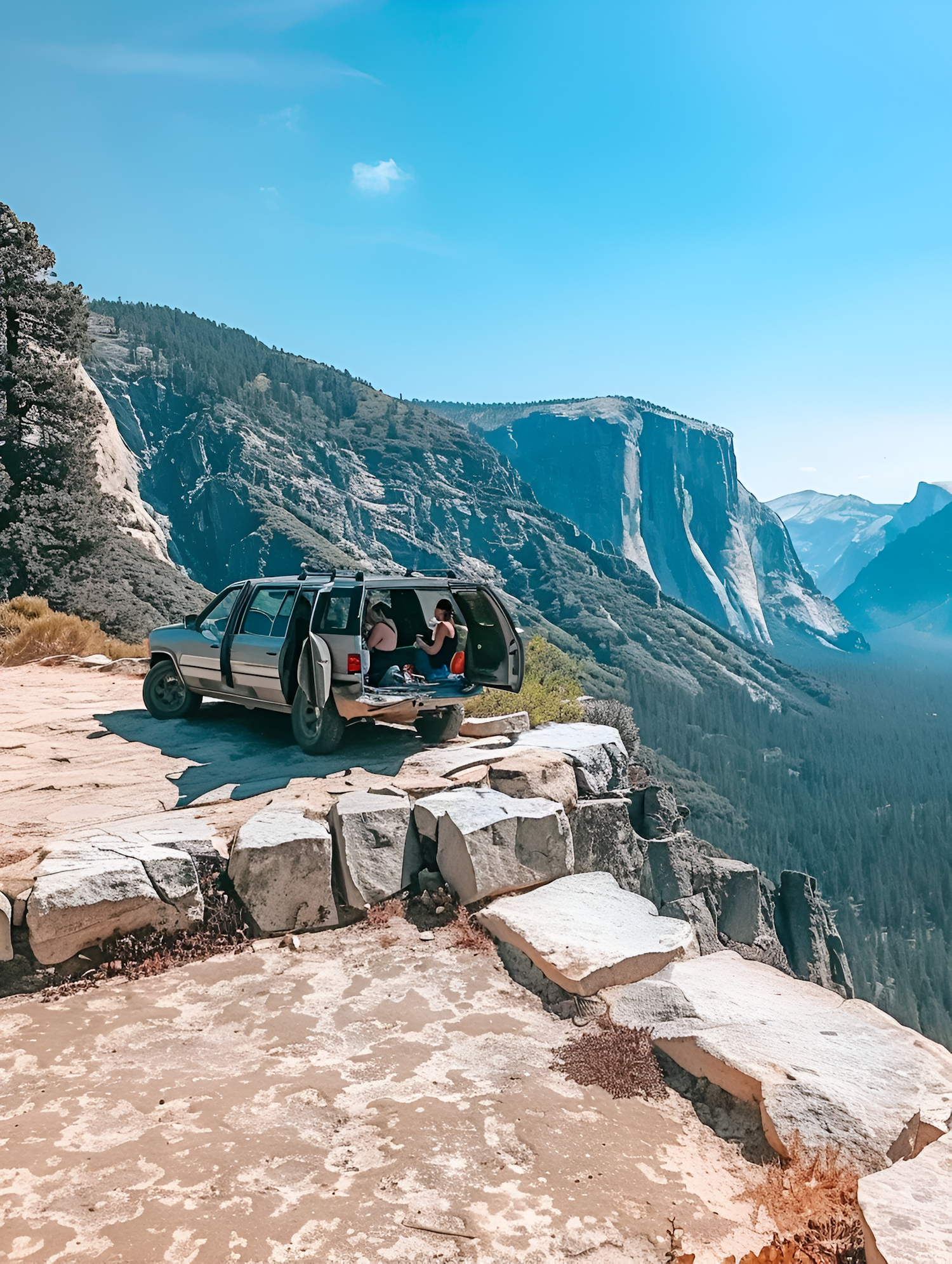 SUV parked on a mountain ledge with two people enjoying a scenic view of forested mountains under a clear blue sky.