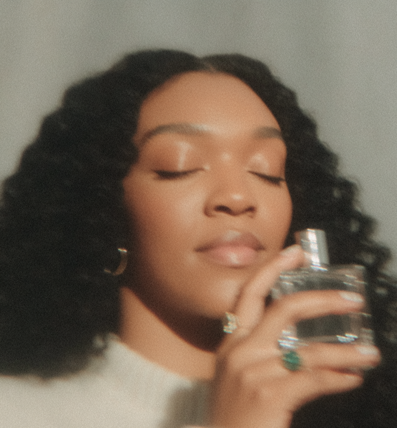 A serene moment of a person enjoying the scent of a perfume, holding a clear glass bottle with soft lighting and a neutral background.