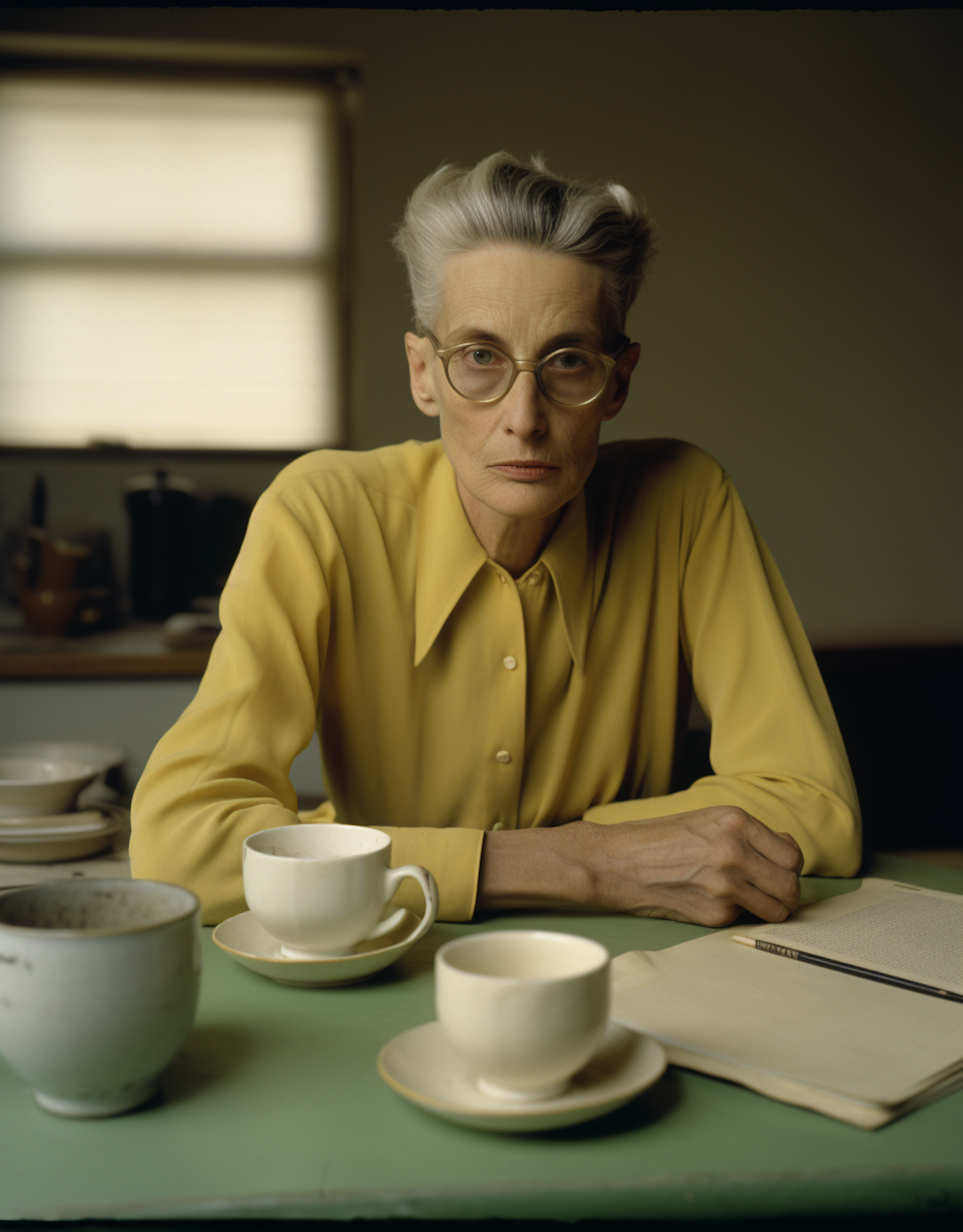 Person in yellow shirt with gray hair and glasses sits at a table with coffee cups and a notebook, creating a contemplative scene.