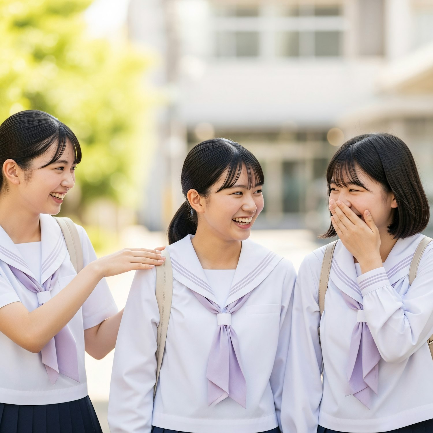 Three students in Japanese school uniforms share a cheerful moment outdoors on a sunny day.