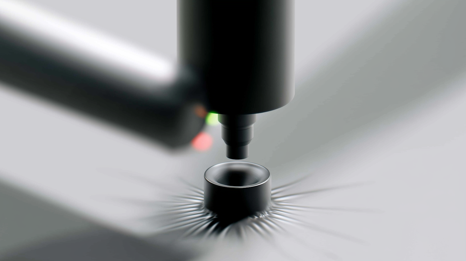 Close-up of a precision tool interacting with a metallic surface, showing ripples and a sleek, modern design. Perfect for tech enthusiasts.