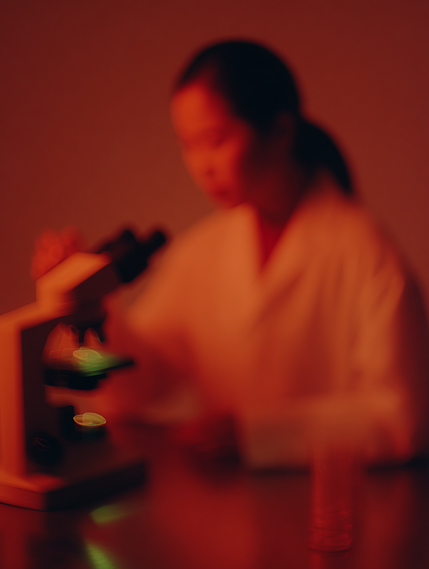 A scientist in a lab coat examines samples under a microscope in a warmly lit laboratory setting, emphasizing focus and research.