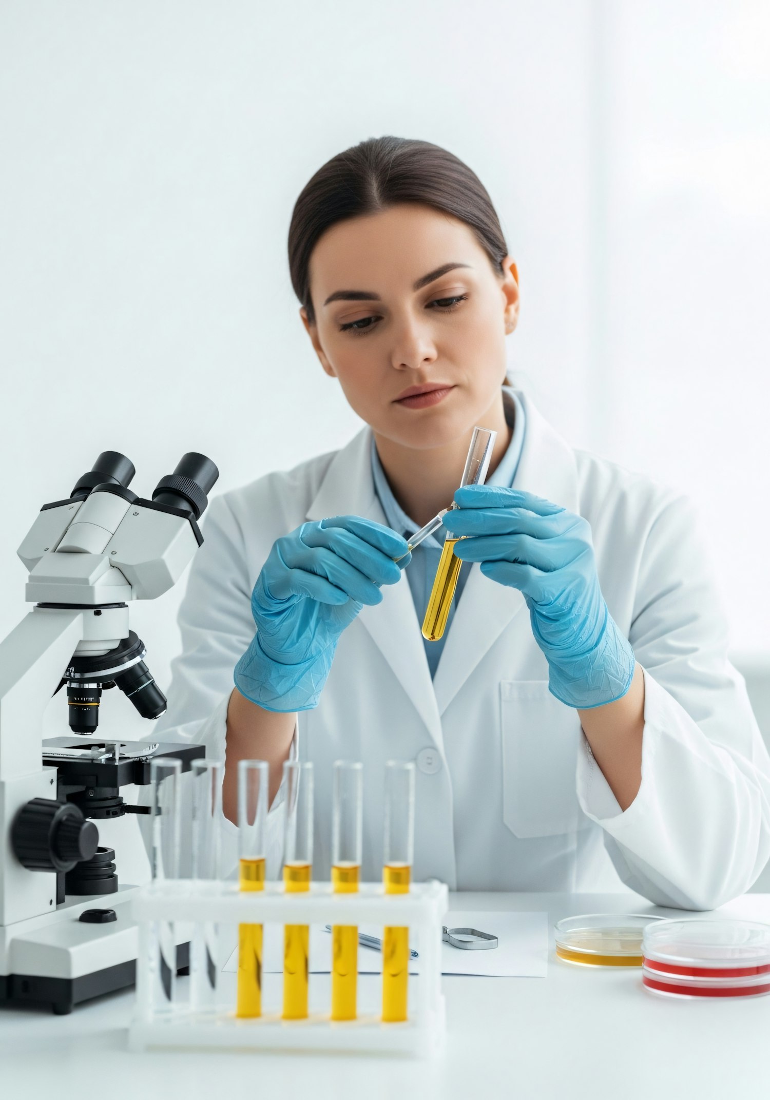 Scientist in a lab coat working with test tubes and a microscope, conducting an experiment with precision and focus.
