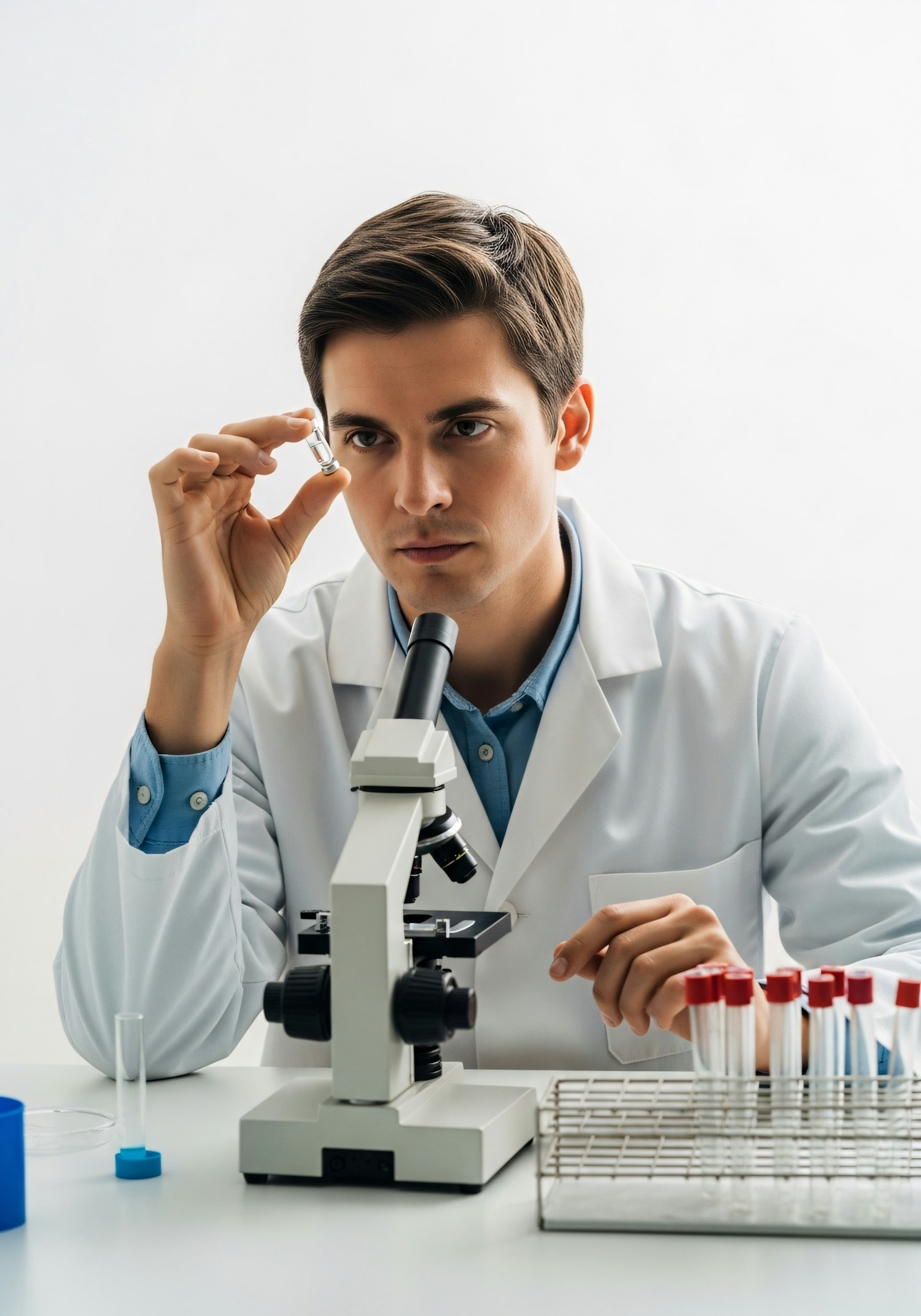 Scientist in a lab coat examining a vial, with a microscope and test tubes on the table, in a clean and professional lab setting.