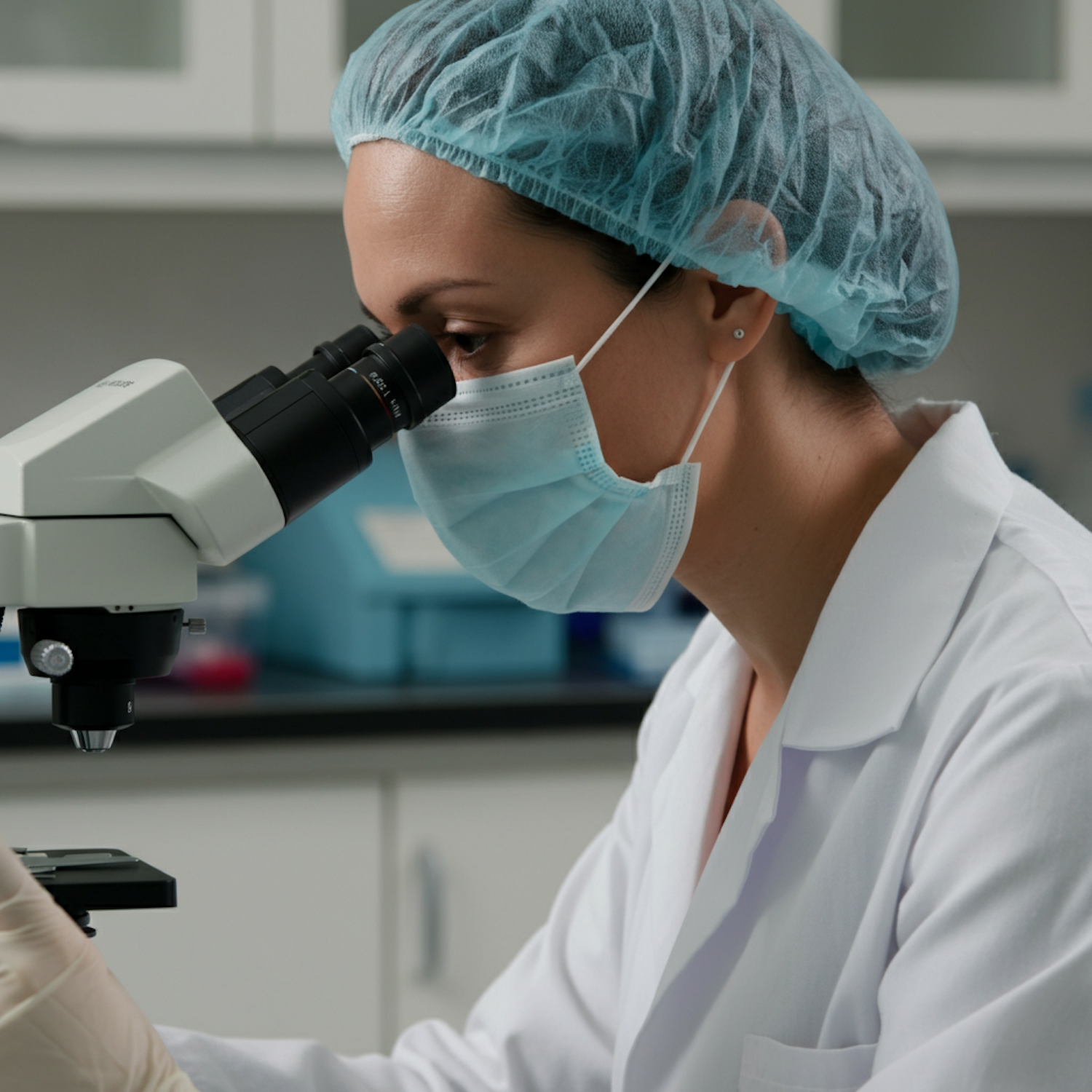 Scientist in a lab coat and mask using a microscope in a professional laboratory setting, surrounded by research equipment.