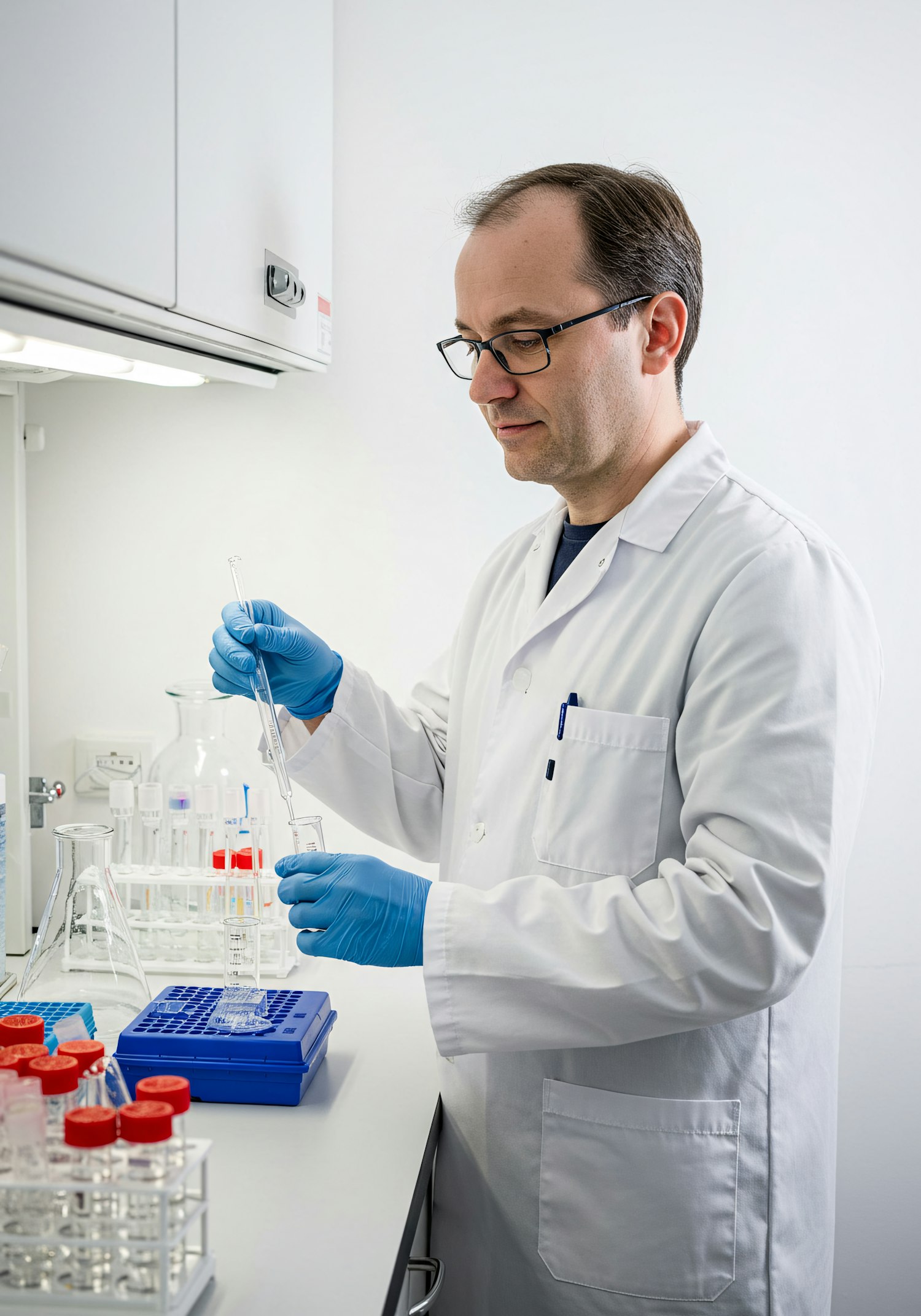 Scientist in a lab coat using a pipette in a clean laboratory setting, surrounded by test tubes and equipment.