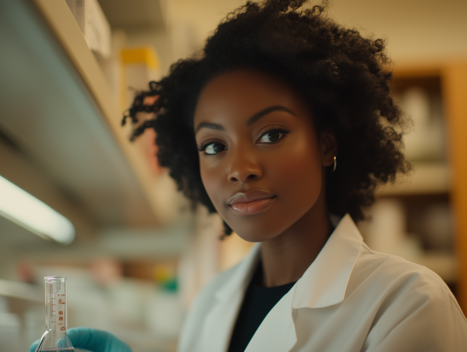 Young Black female scientist in a lab coat, holding a beaker, with a focused expression in a laboratory setting.