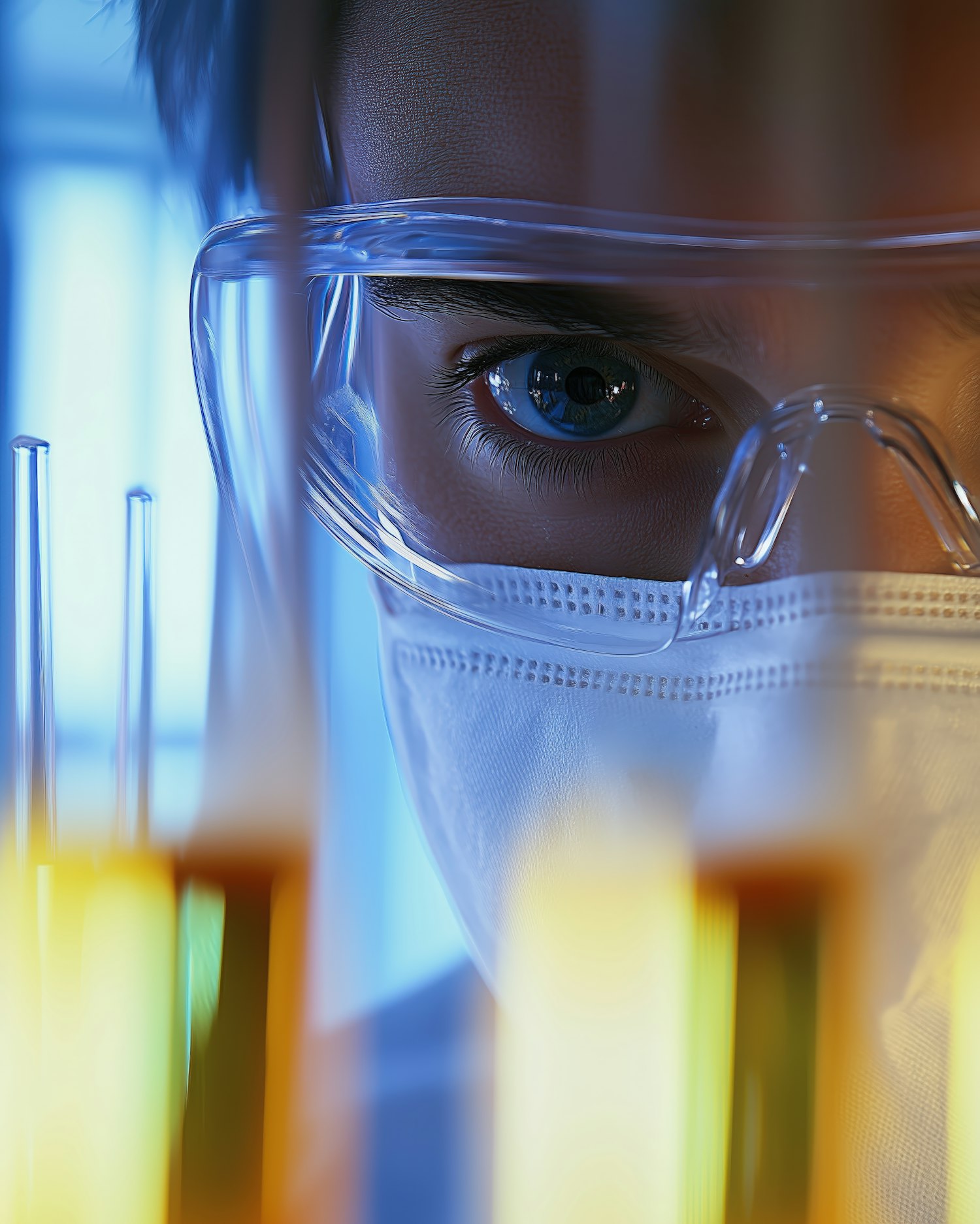 Close-up of a scientist in goggles and mask examining test tubes with colorful liquids in a lab, set against a cool blue background.