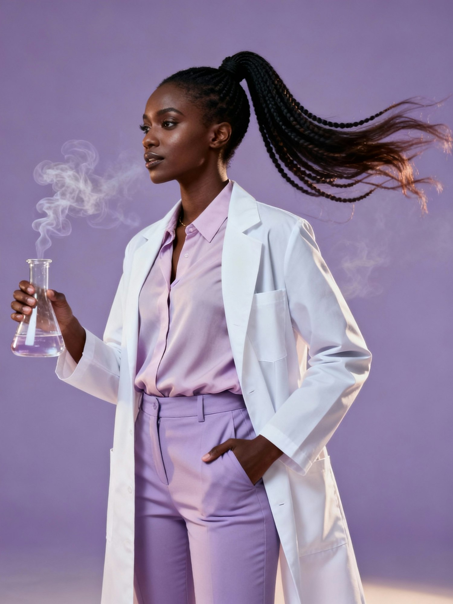 High-definition, cinematic full-body portrait of a stylish Black female scientist wearing a sleek, tailored white lab coat over a soft pastel blouse and fitted trousers. Her hair is styled in a trending high ponytail with subtle twists, flowing dynamically as if caught in a gentle breeze. She holds a glass beaker or test tube, with faint wisps of vapor or mist swirling around her to add motion and cinematic depth. The background is a smooth, muted lavender that complements her skin tone and outfit. Soft, directional lighting highlights her hair, the textures of her coat, and the motion of the vapor, while subtle rim lighting accentuates her silhouette. The mood is polished, dynamic, and fashion-forward—scientific authority elevated to high-fashion editorial artistry.