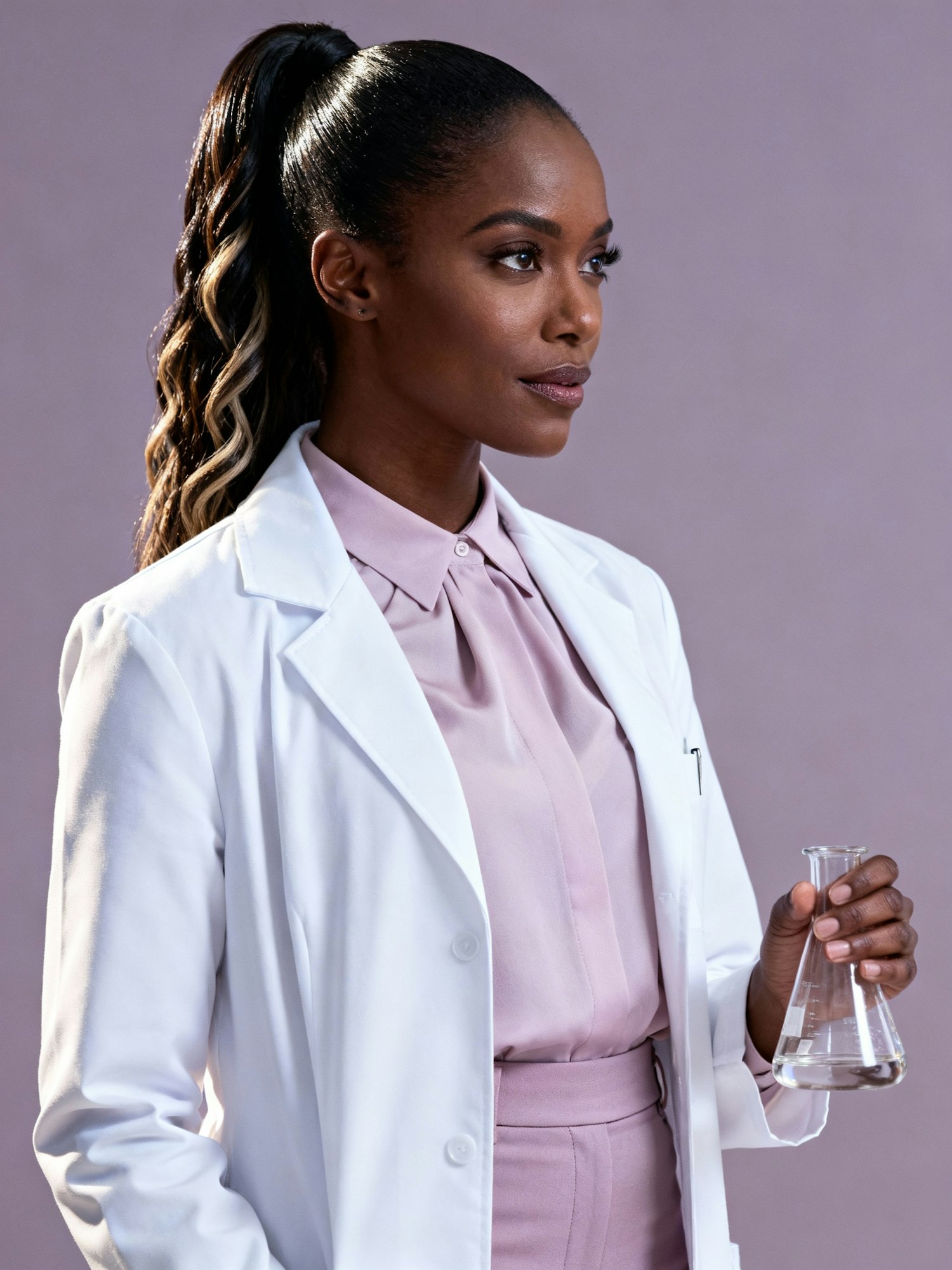 High-definition, cinematic portrait of a stylish Black female scientist wearing a sleek, tailored white lab coat over a soft pastel blouse and fitted trousers. Her hair is styled in a trending high ponytail with subtle twists, adding texture and modern flair. She holds a glass beaker or test tube, standing against a smooth, muted lavender background that complements her outfit and skin tone. Soft, directional lighting highlights her hair, the textures of her coat, and her confident, focused expression. The overall mood is polished, modern, and fashion-forward—scientific expertise meets high-fashion editorial style.