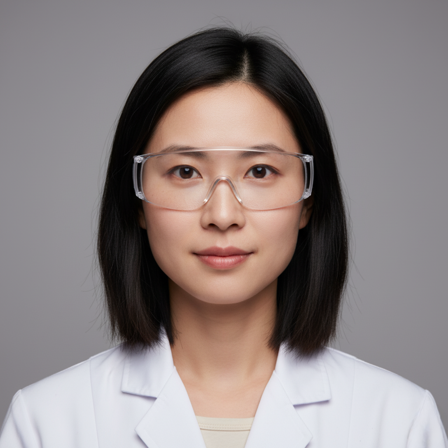 Portrait of a professional woman in a lab coat and safety goggles, set against a neutral background, emphasizing her scientific role.