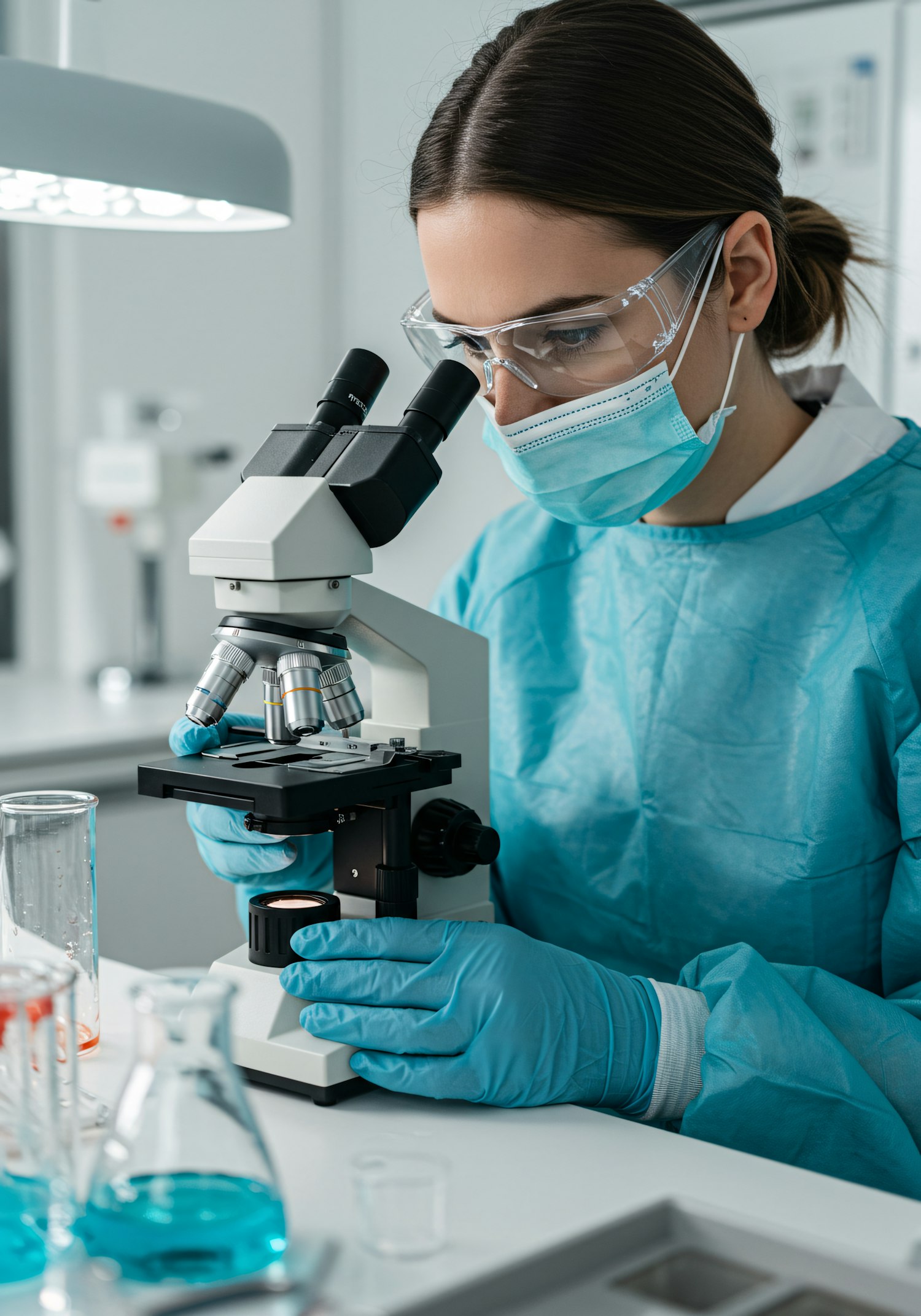Scientist in protective gear using a microscope in a lab, surrounded by glassware with colorful liquids, focused on research.