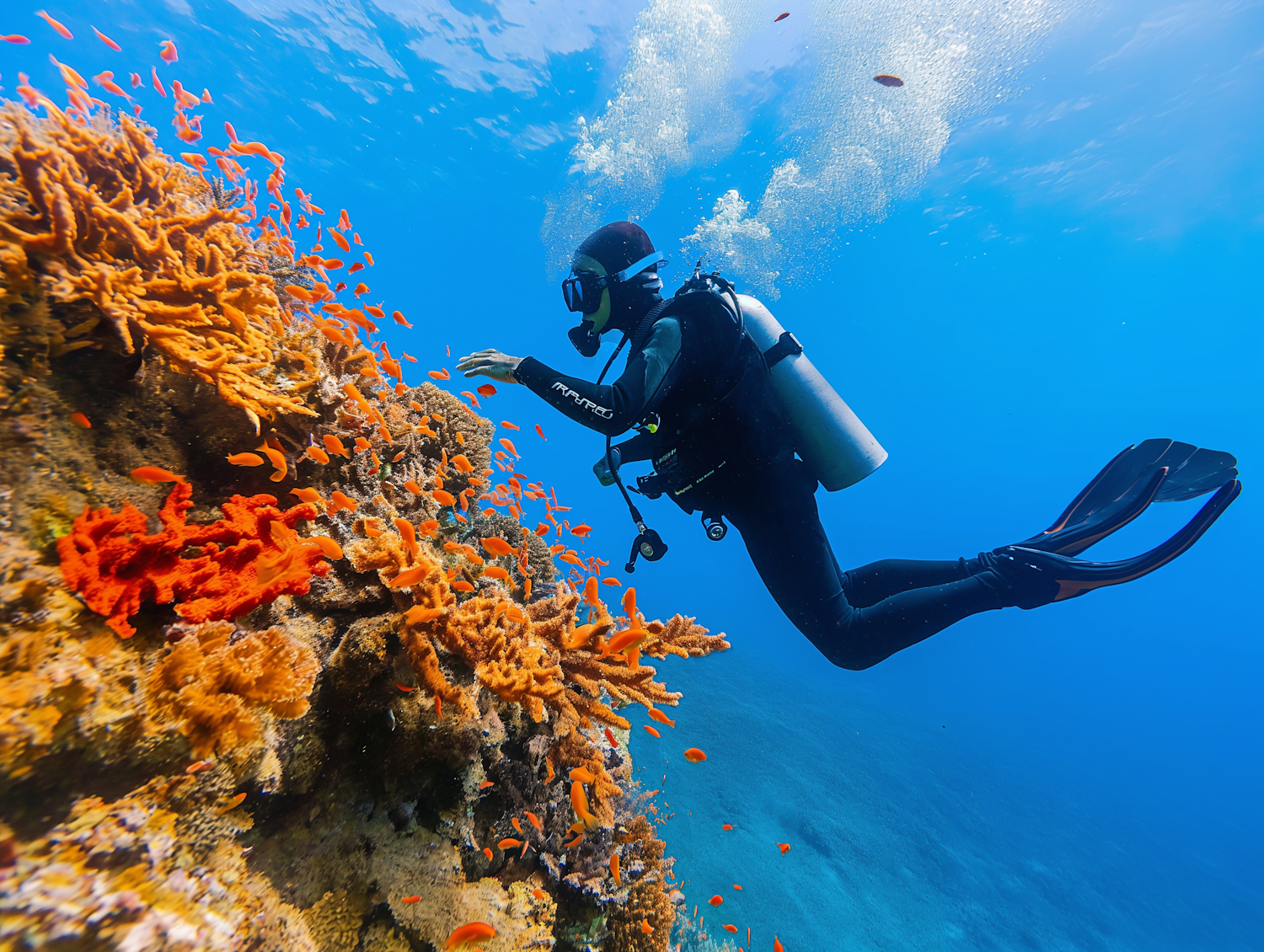 Scuba diver explores vibrant coral reef with orange fish in clear blue water, surrounded by colorful corals and bubbles.