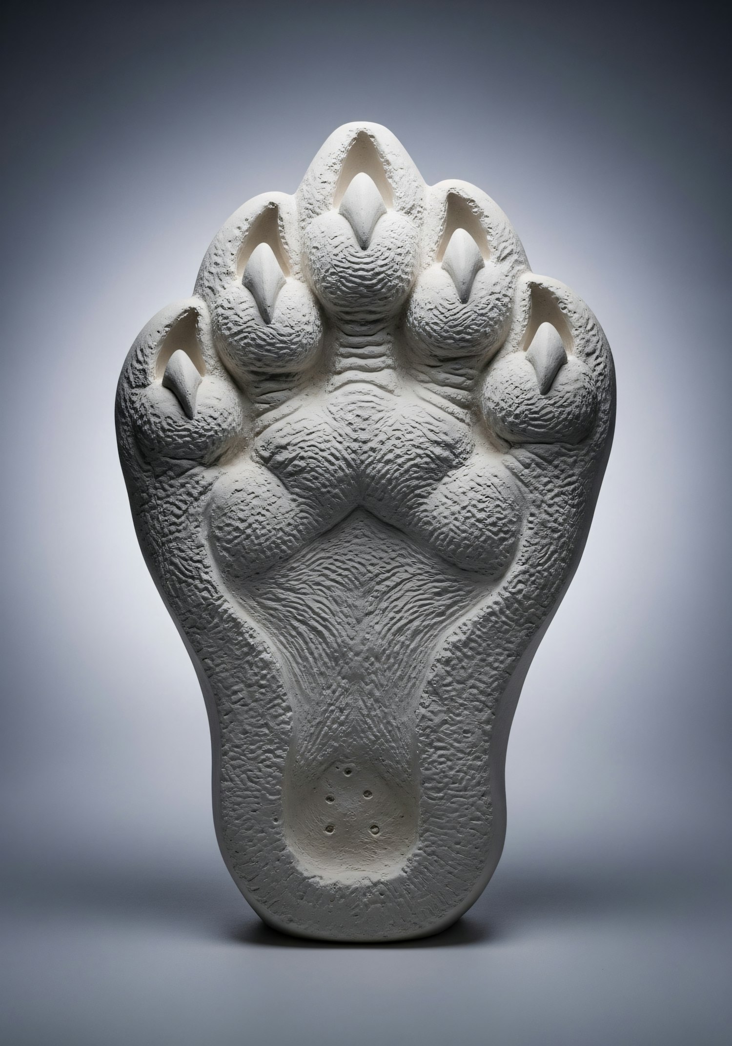 A detailed sculpture of a large animal paw print, showcasing intricate textures and claw impressions against a neutral gradient background.