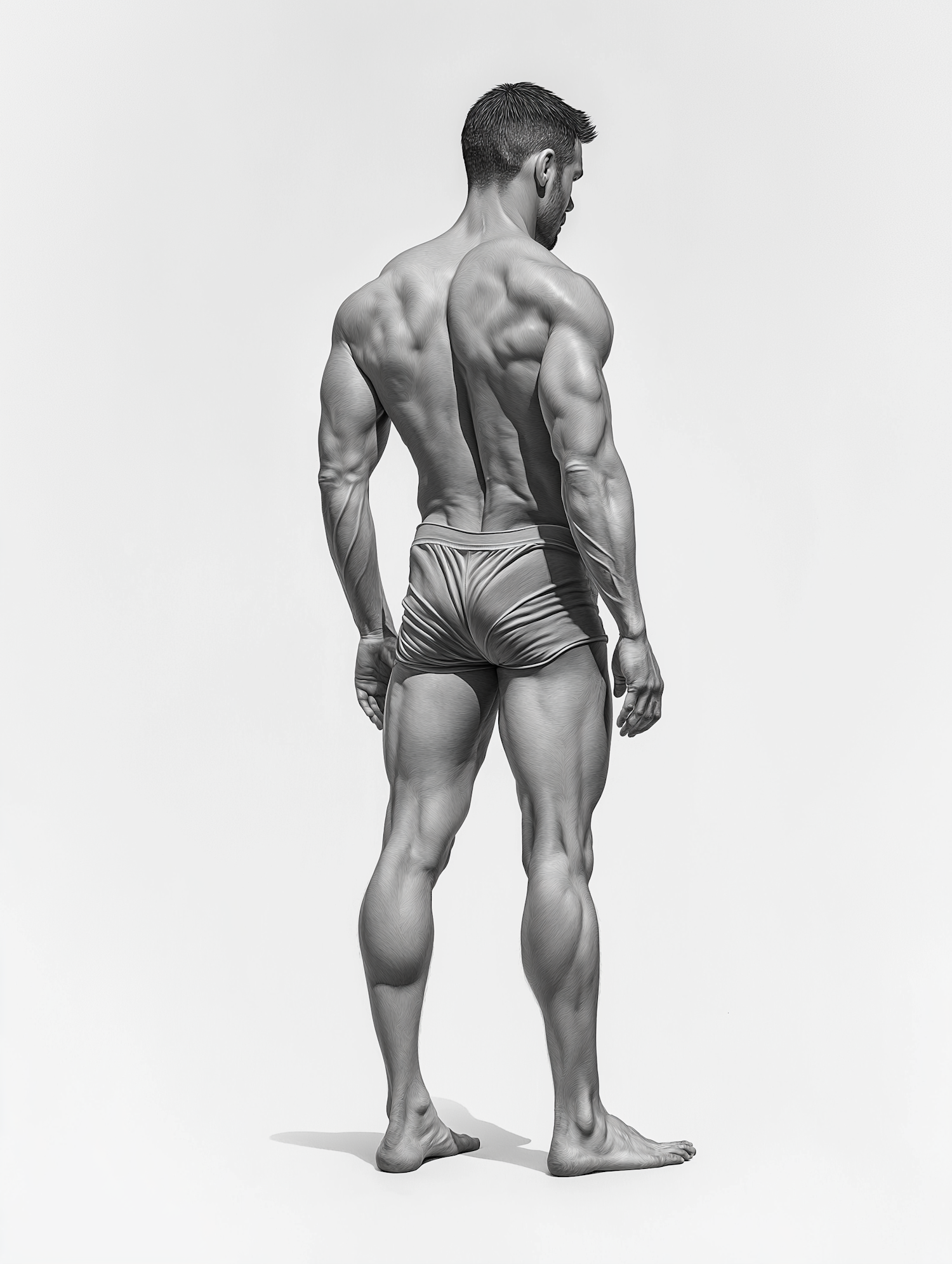 Monochromatic illustration of a muscular man from behind, highlighting his defined physique and strong posture.
