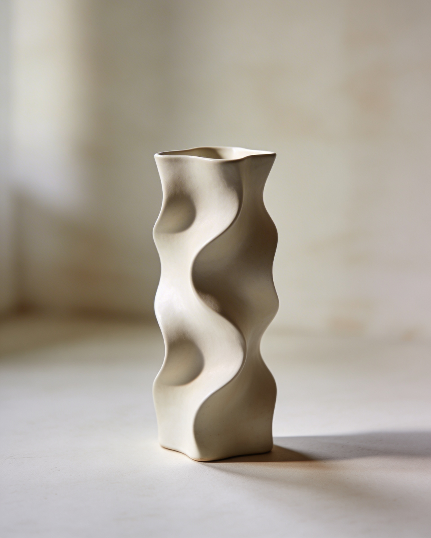 A tall asymmetric vase with organic hand‑built curves, soft matte finish, no text.