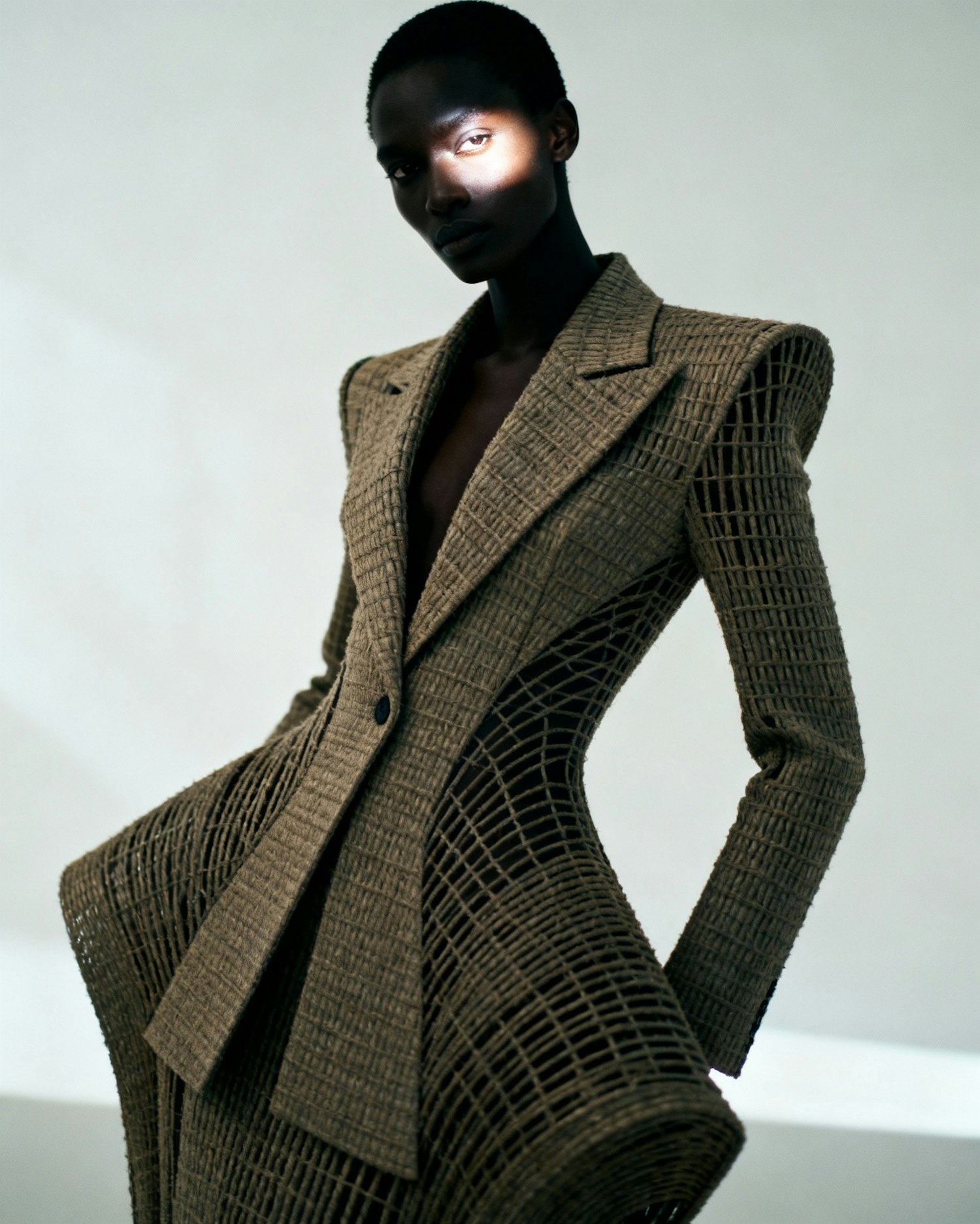 An ultra-high-definition fashion portrait of a mysterious Black glowing face individual in a woven, artistic dress poses confidently, showcasing intricate design and elegance against a minimal background, set against a light minimalist background. The ensemble blends futuristic tailoring with avant-garde elegance, emphasising clean lines and bold silhouettes adds architectural drama, while the suit contours softly around the body, celebrating form and presence. Lighting is soft and directional, casting subtle shadows that enhance texture and depth. The mood is enigmatic, editorial, and visually commanding—ideal for showcasing inclusive fashion through sculptural styling and cinematic clarity.