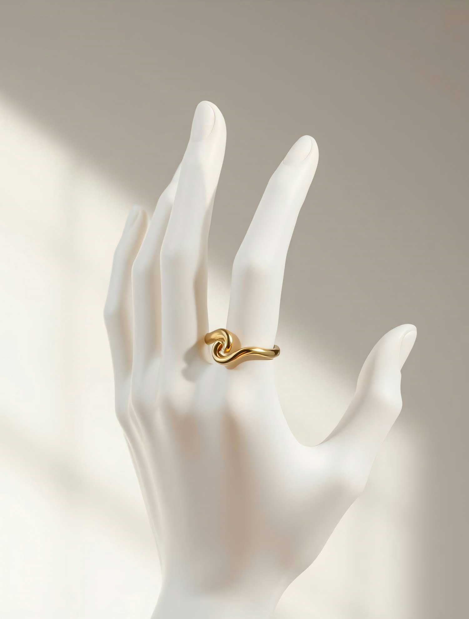 Elegant porcelain-like hand with a unique twisted gold ring, set against a soft neutral background, showcasing minimalistic beauty.