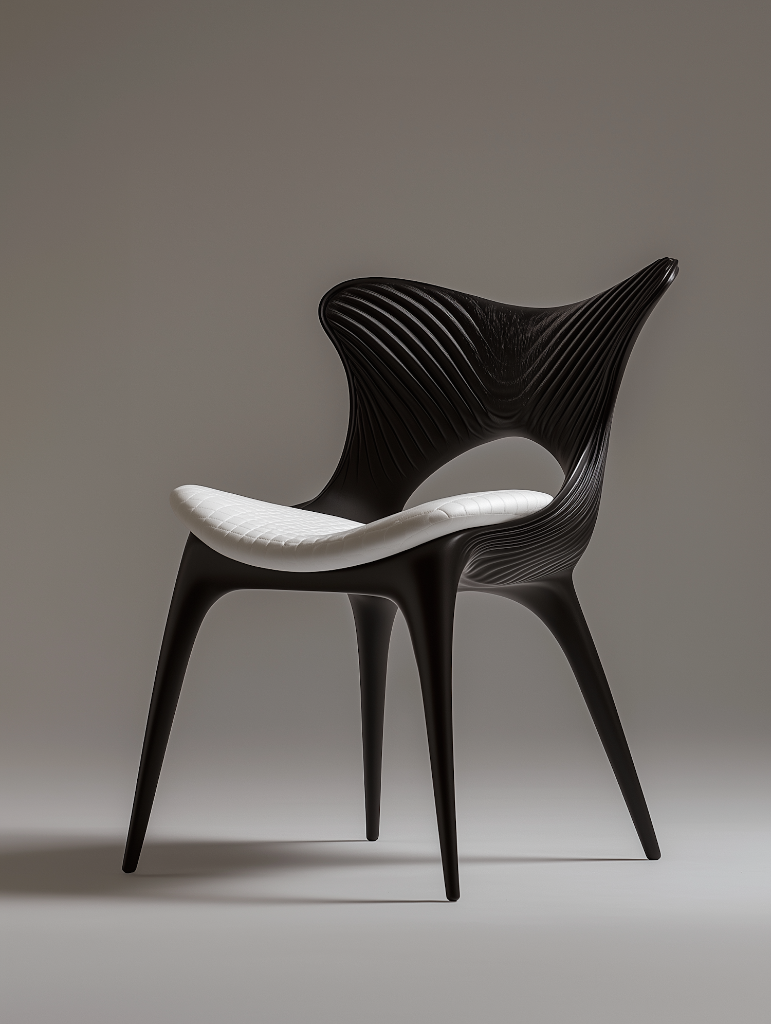 Modern black chair with sculptural curves and a white quilted seat cushion, perfect for contemporary interiors.
