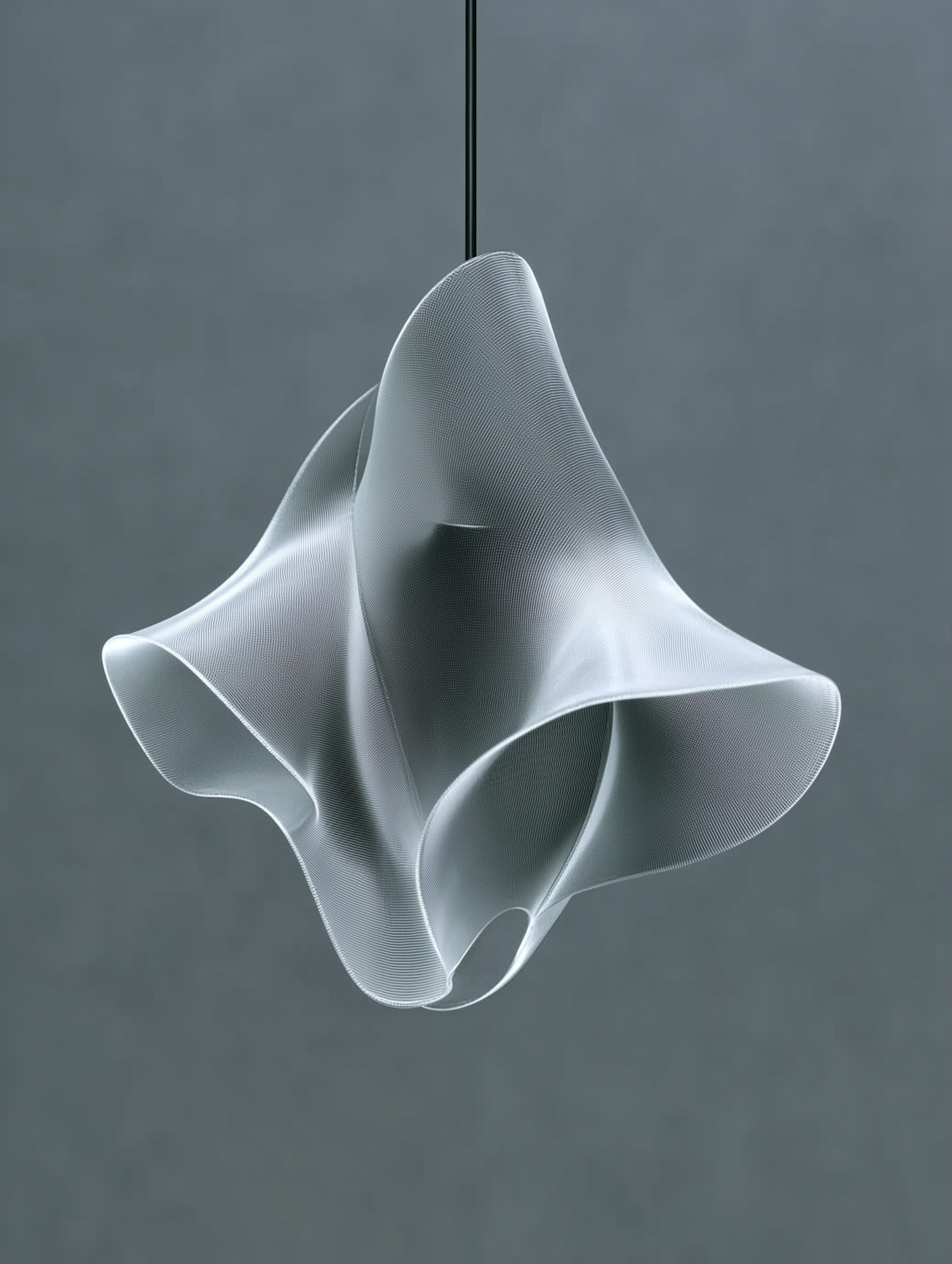 A modern pendant light with a flowing, translucent design, suspended against a neutral gray background, showcasing its artistic form.