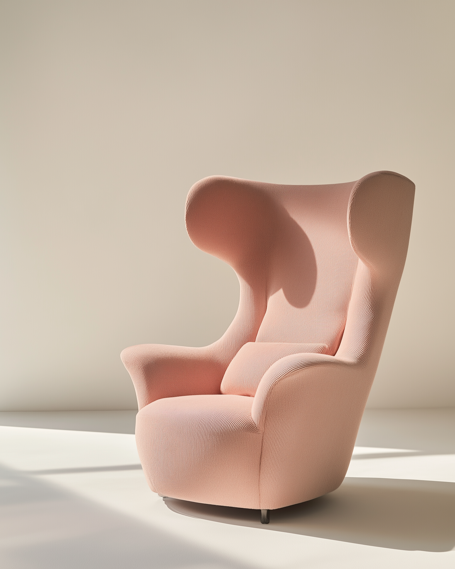 Sculptural pastel pink armchair with winged backrest in a minimalist setting, bathed in soft natural light.