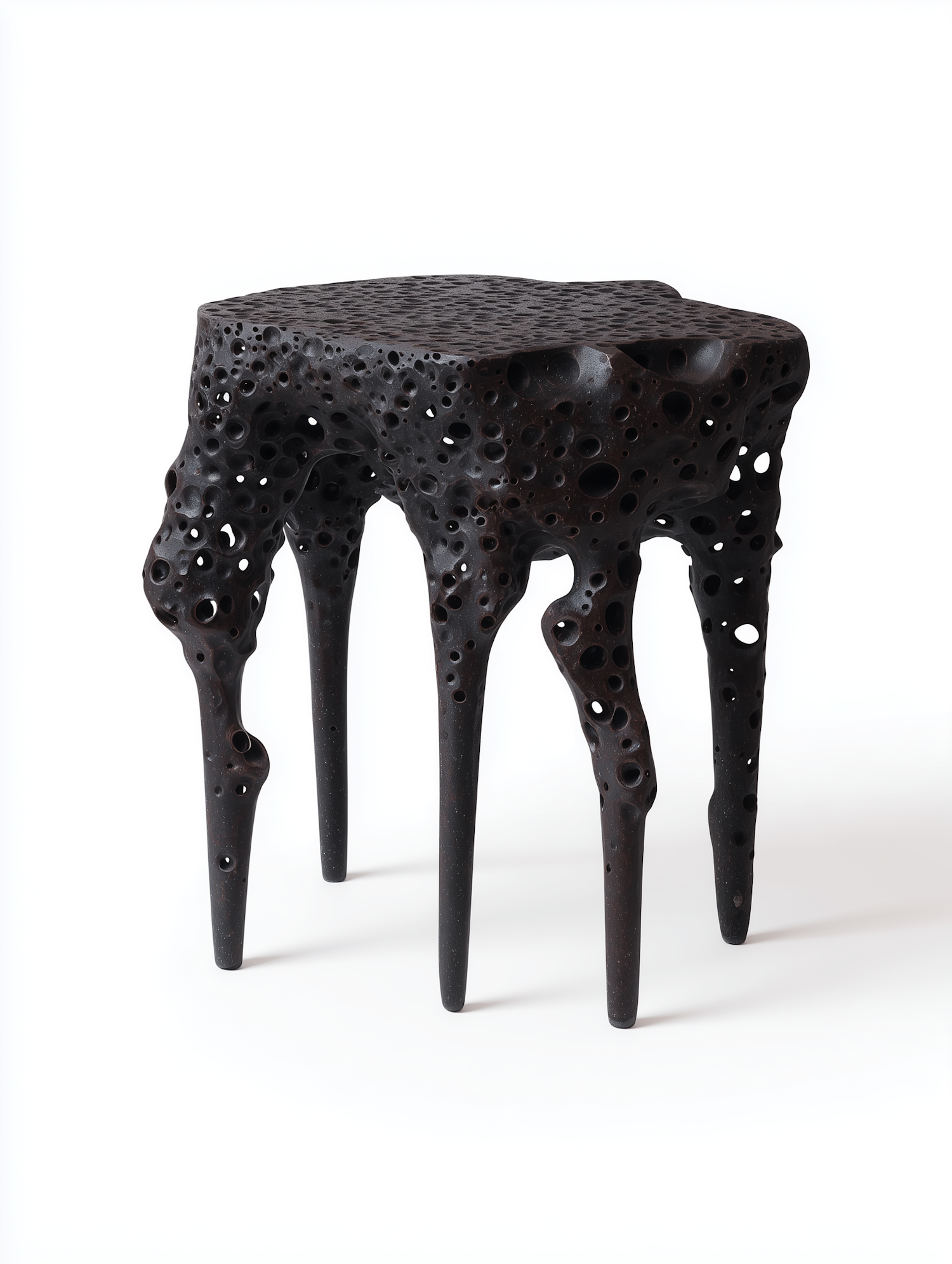 A dark, porous stool with an organic design, resembling volcanic rock, set against a white background for a striking contrast.