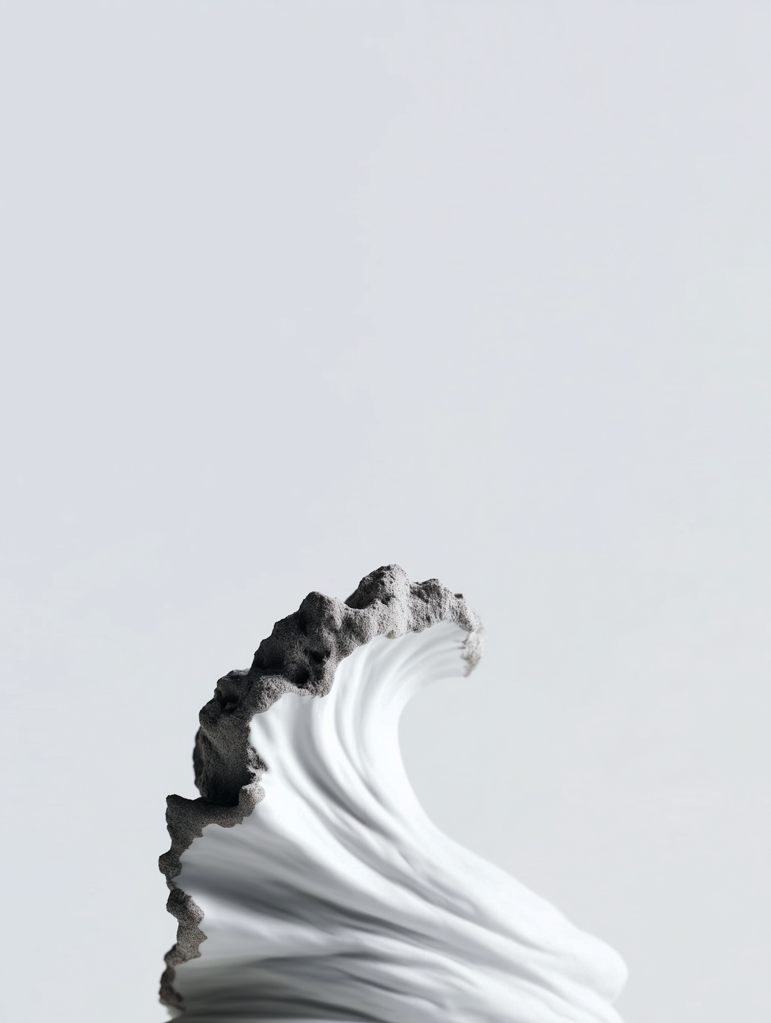 A striking abstract sculpture with a rocky edge blending into smooth, flowing white material, resembling a wave or fabric in motion.