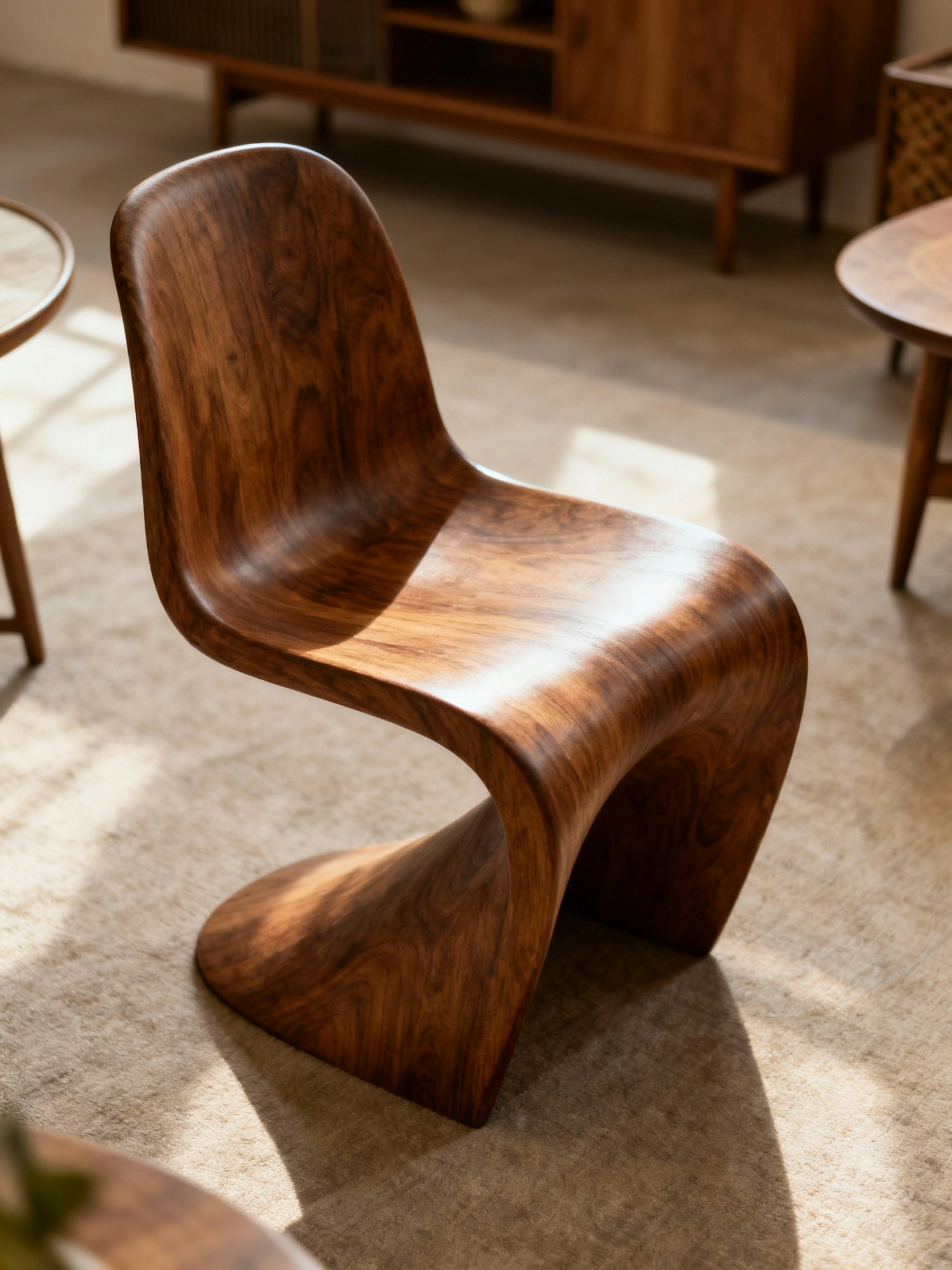 Professional interior design photography, warm and textured atmosphere, soft natural lighting, retro-modern aesthetic, mid-century inspired furniture, crafted wooden details, neutral tones with accents of earthy colors, editorial style, timeless and sophisticated mood. A sculptural wooden chair seen from a slightly elevated 3/4 top view, showing the seat and backrest textures. The perspective emphasizes the organic curves of the chair and the craftsmanship of the wood, with soft daylight highlighting its surface.