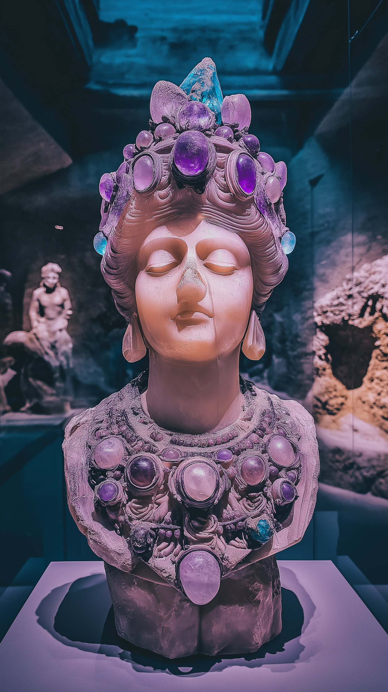 Marble bust adorned with purple gemstones, serene expression, displayed in a dimly lit museum setting with other sculptures.