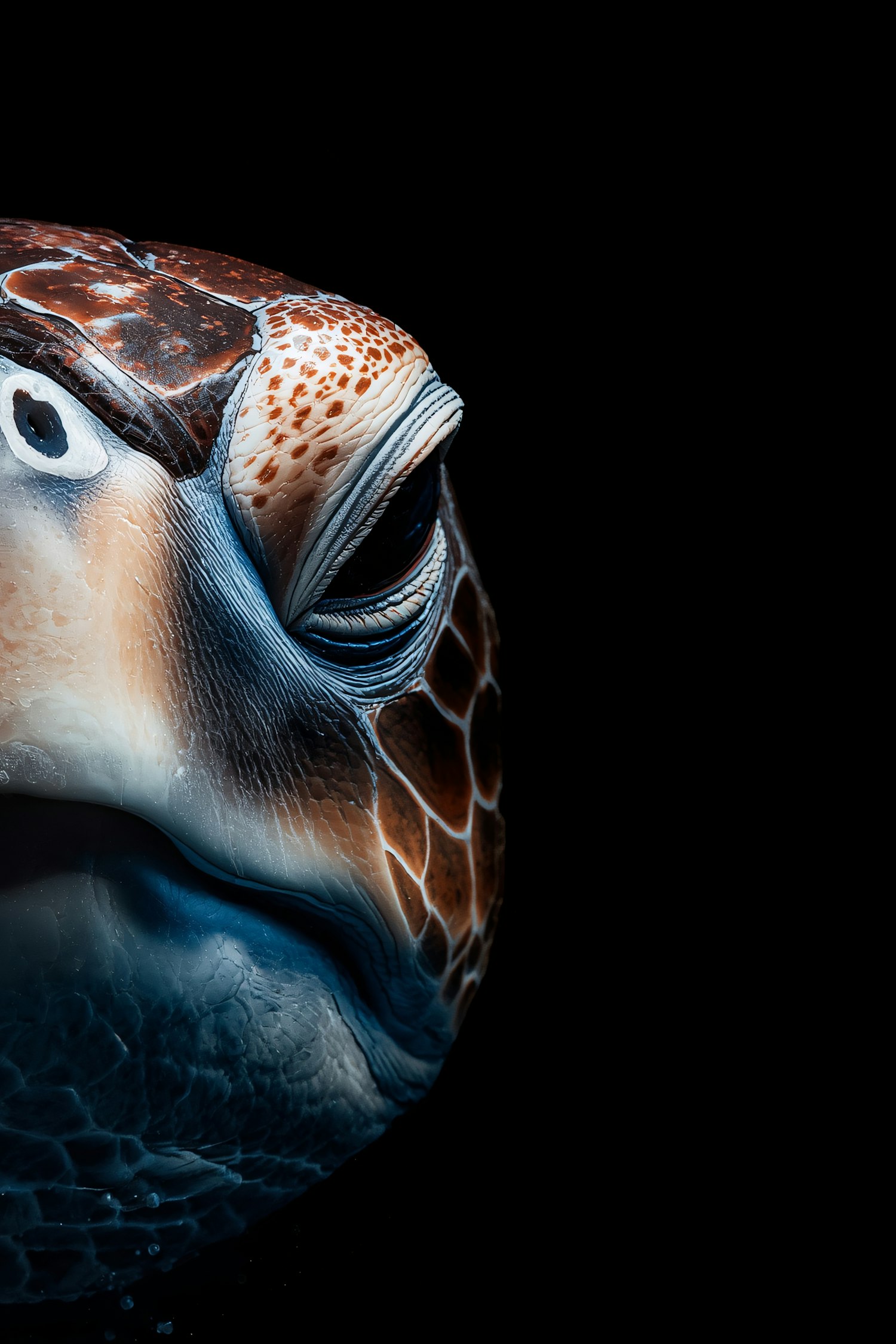 Close-up of a sea turtle's head with detailed textures and vibrant colors against a black background, highlighting its natural beauty.