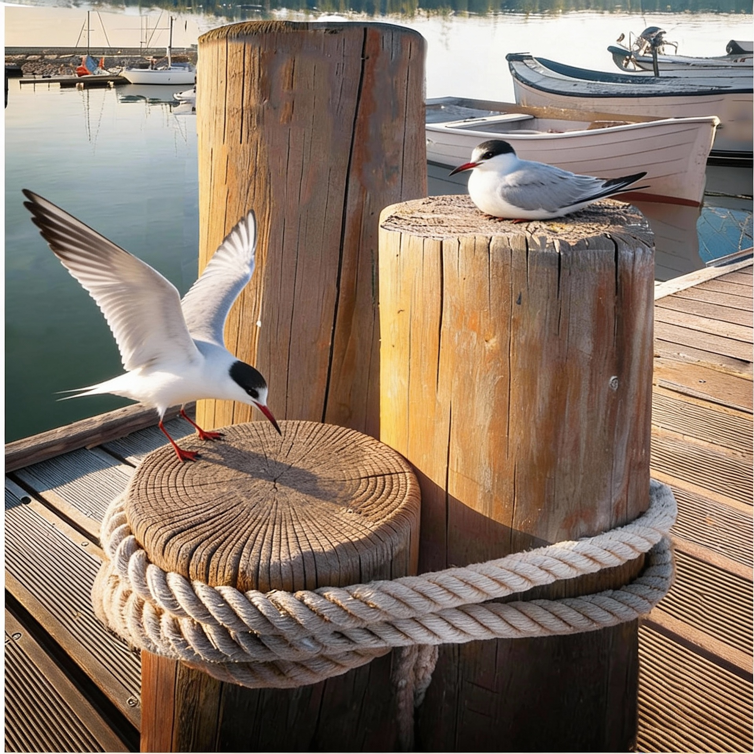 Two seabirds on wooden posts by a dock, one in flight and one resting, with ropes and boats in the background under warm sunlight.