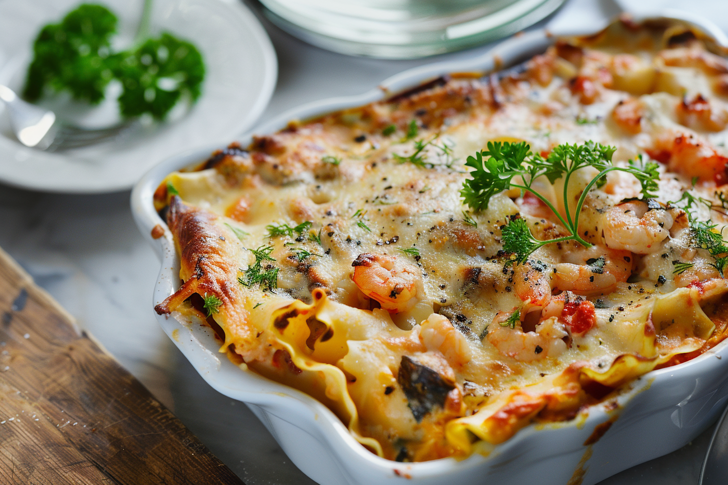 Mouthwatering seafood lasagna with shrimp, melted cheese, and herbs in a white baking dish, perfect for a gourmet meal.
