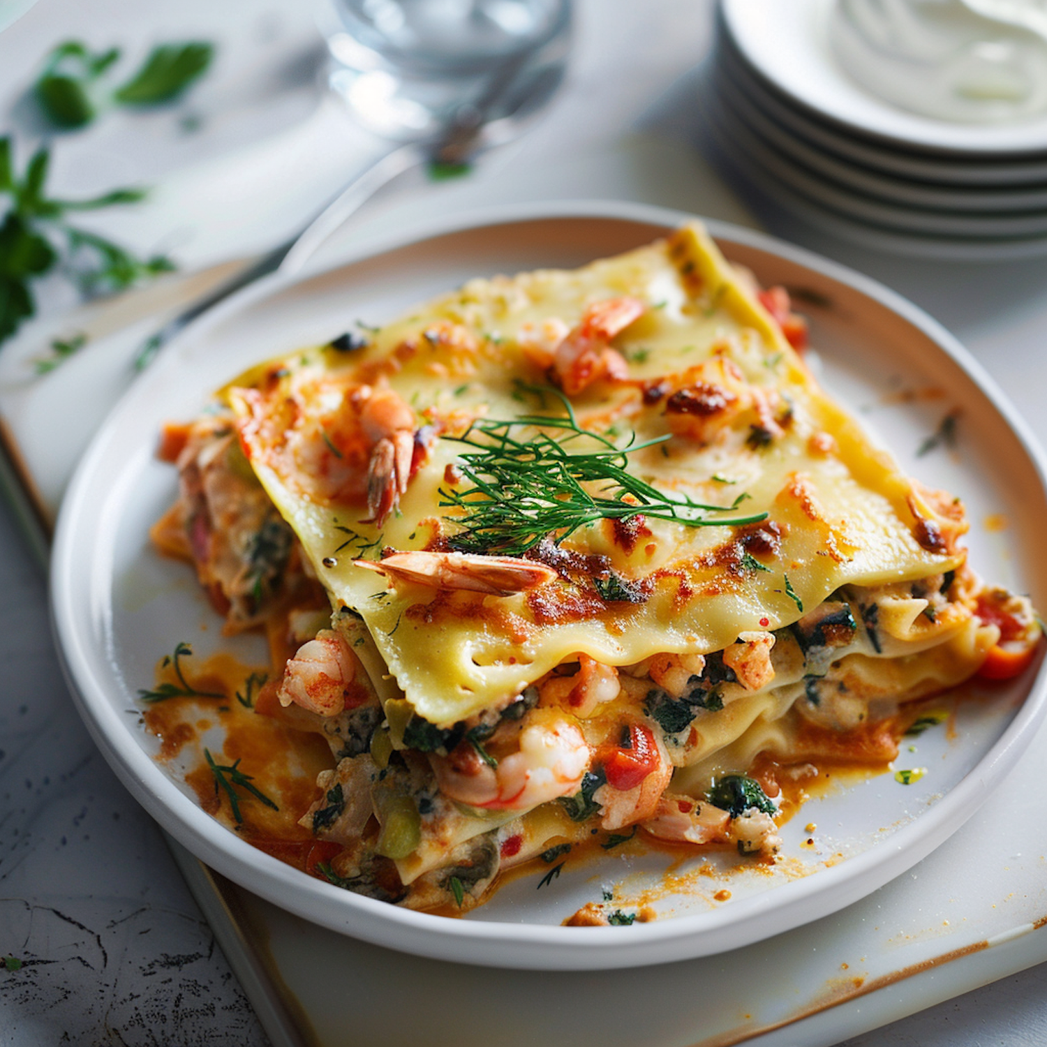 Mouthwatering seafood lasagna with shrimp and spinach, topped with fresh dill on a white plate. Perfect for a gourmet meal.
