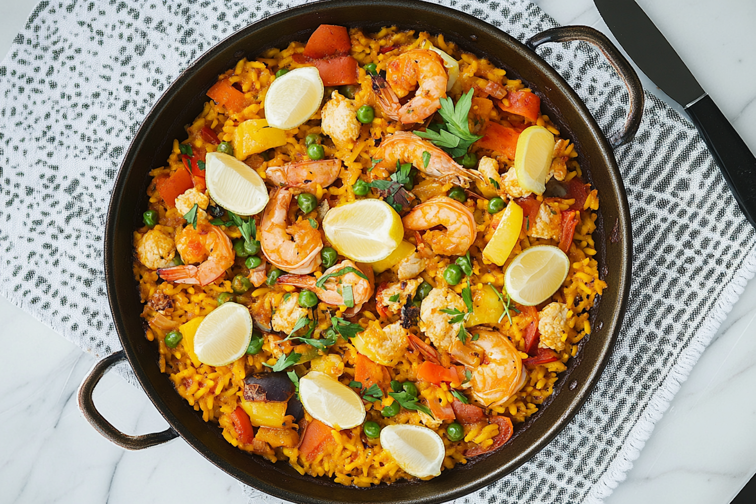 A colorful seafood paella with shrimp, chicken, veggies, and lemon wedges in a black pan, perfect for a flavorful Mediterranean meal.