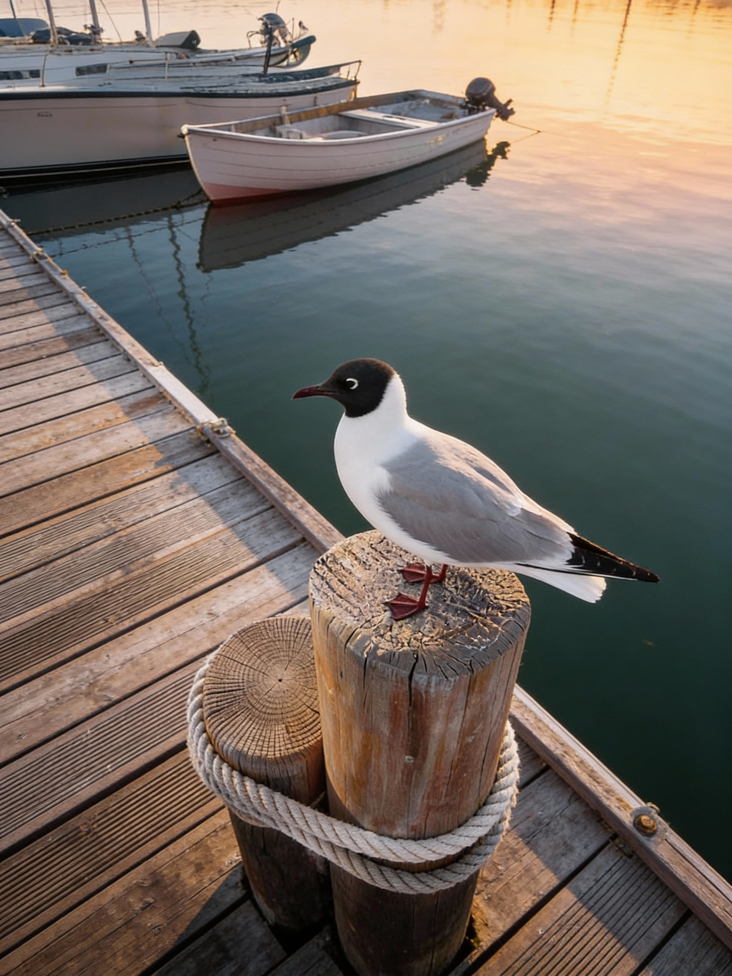A seagull perched on a dock post with boats and a sunset reflecting on calm water, creating a peaceful maritime scene.