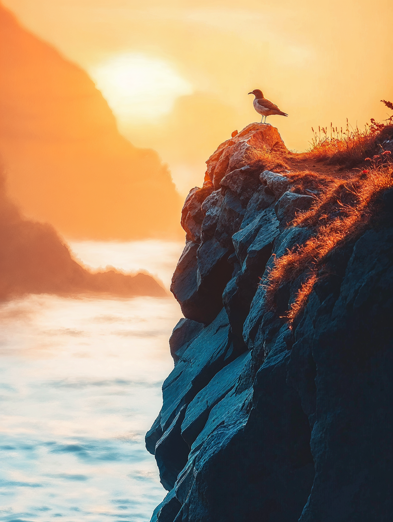 A seagull perched on a sunlit cliff during a golden sunset, overlooking a misty ocean with distant cliffs in the background.