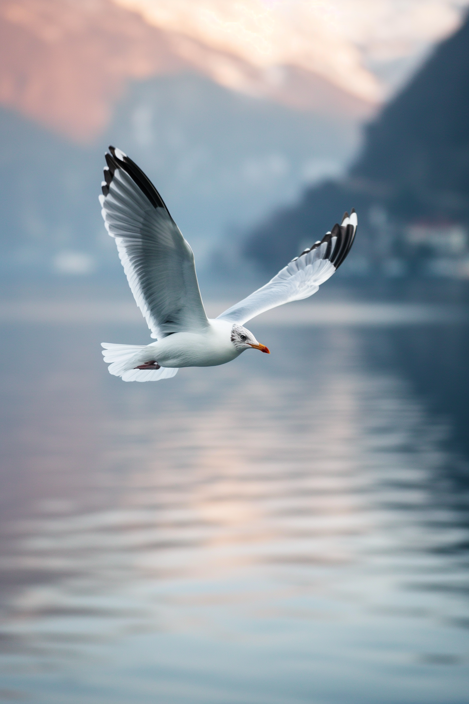A seagull with black-tipped wings flies over a tranquil lake, with mountains in the blurred background.