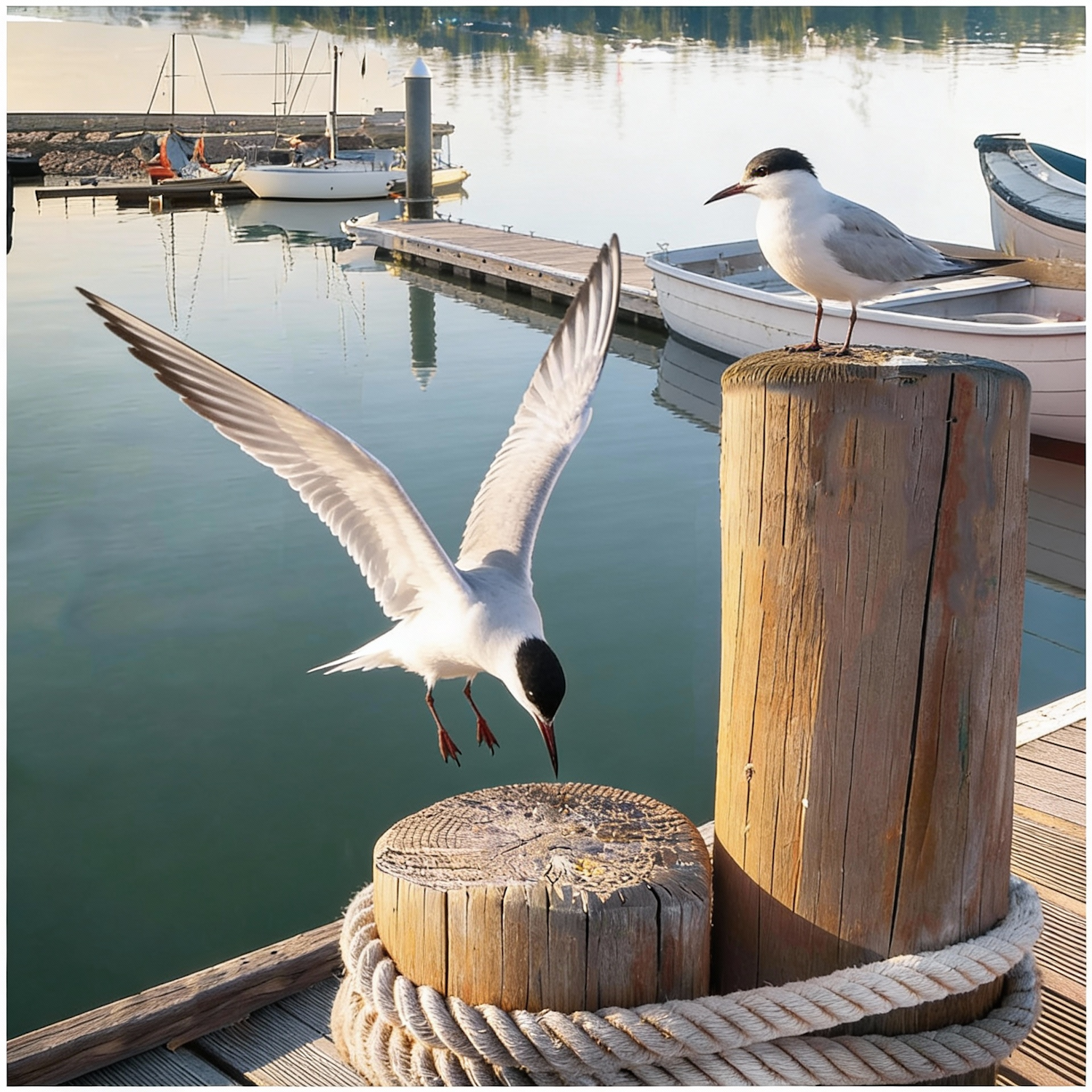Two seagulls interact on a wooden post at a marina, with calm water and docked boats in the background.