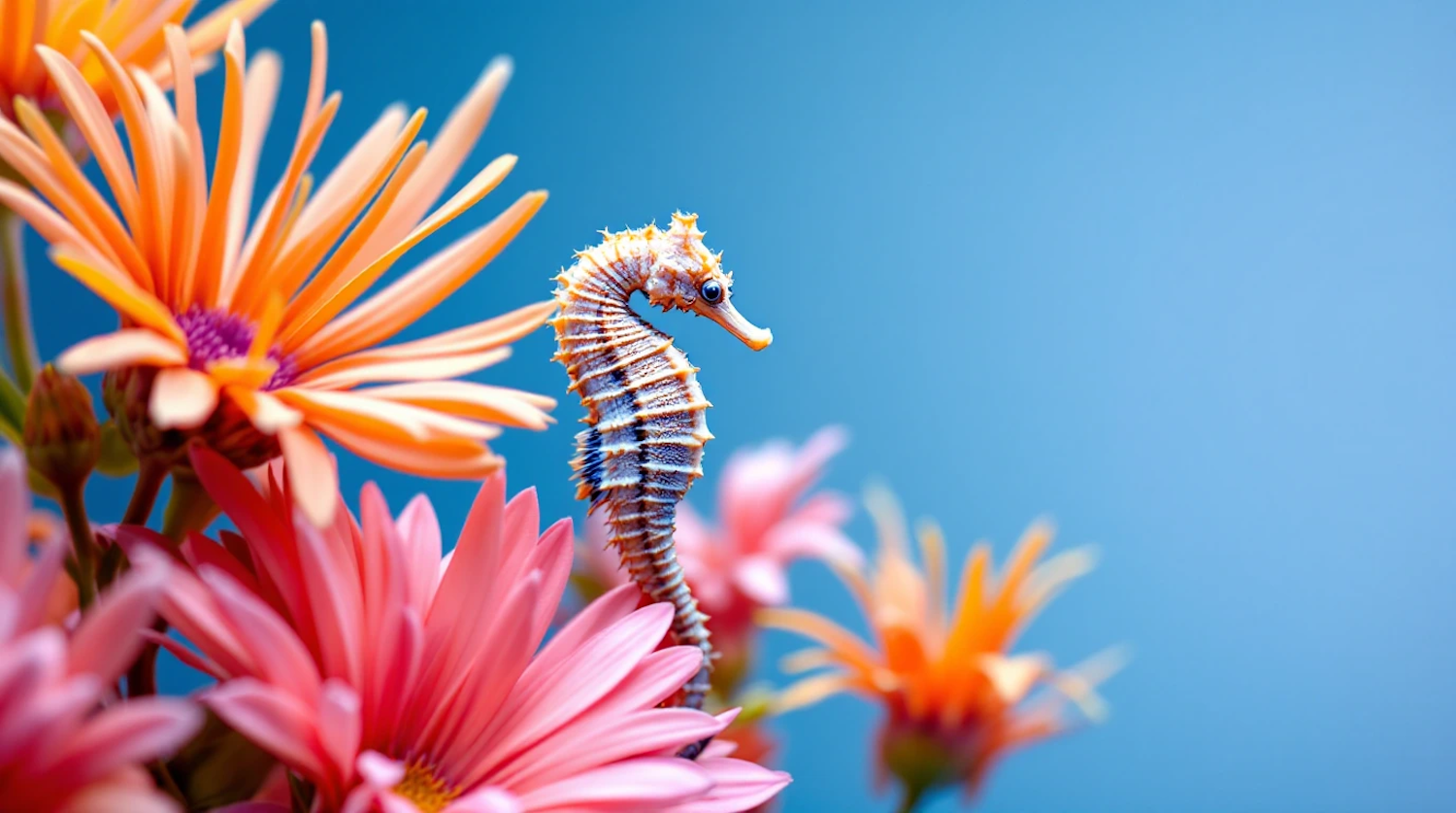 A seahorse nestled among vibrant orange and pink flowers against a soft blue background, creating a whimsical and colorful scene.