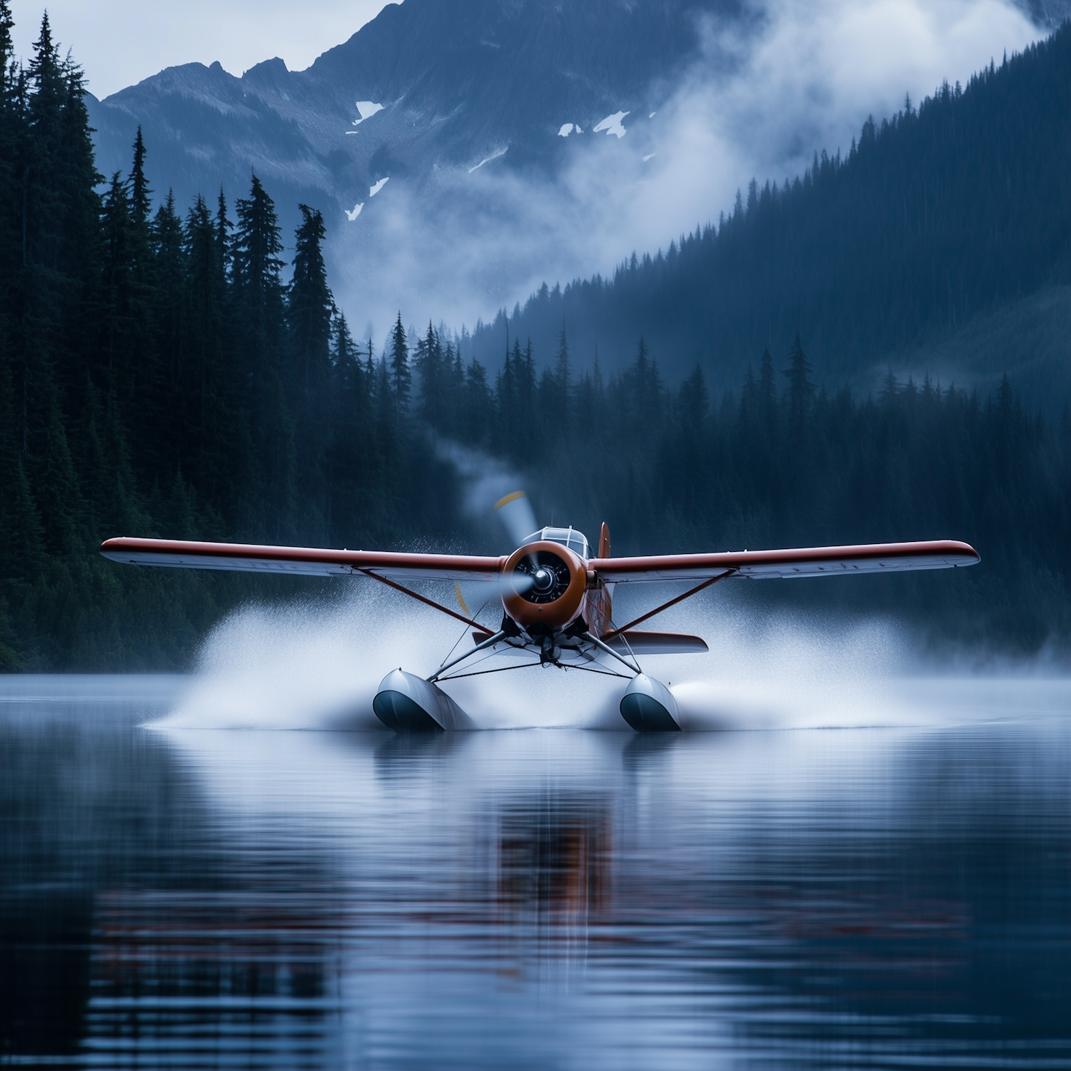 Orange seaplane taking off from a misty lake, surrounded by evergreen forests and mountains in a serene wilderness setting.