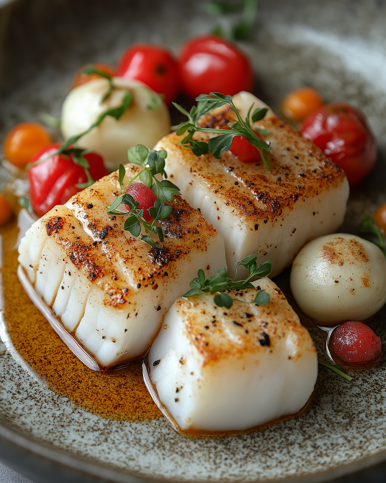 Seared scallops with golden crust, garnished with microgreens, cherry tomatoes, and pearl onions on a rustic ceramic plate.