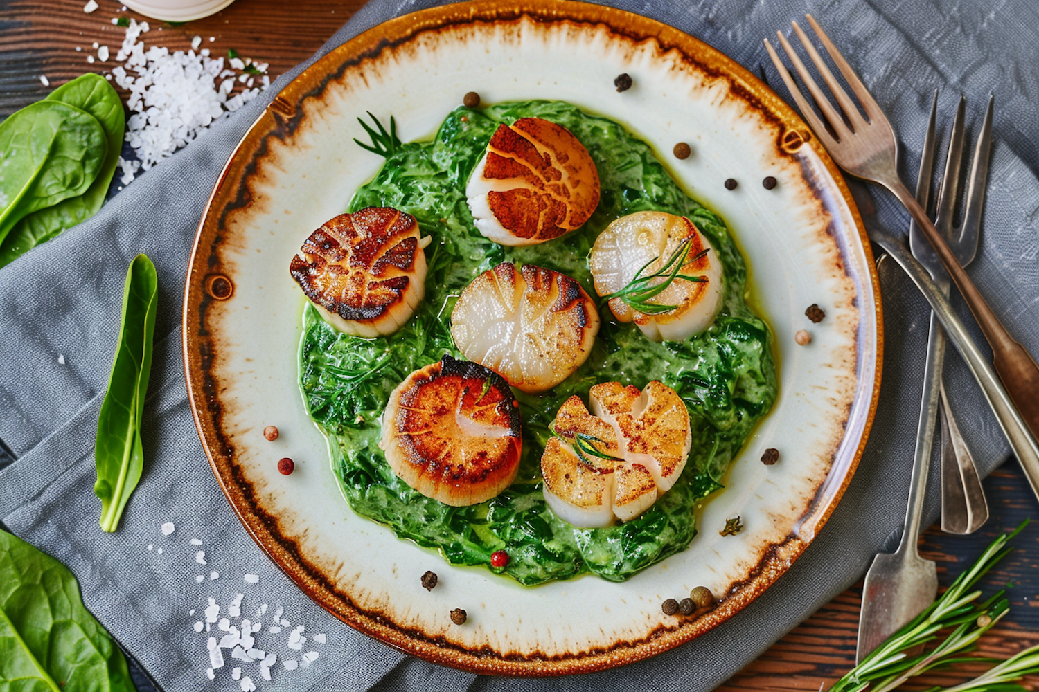 Seared scallops on creamy spinach, garnished with rosemary. Rustic plate with peppercorns and salt, creating a gourmet presentation.