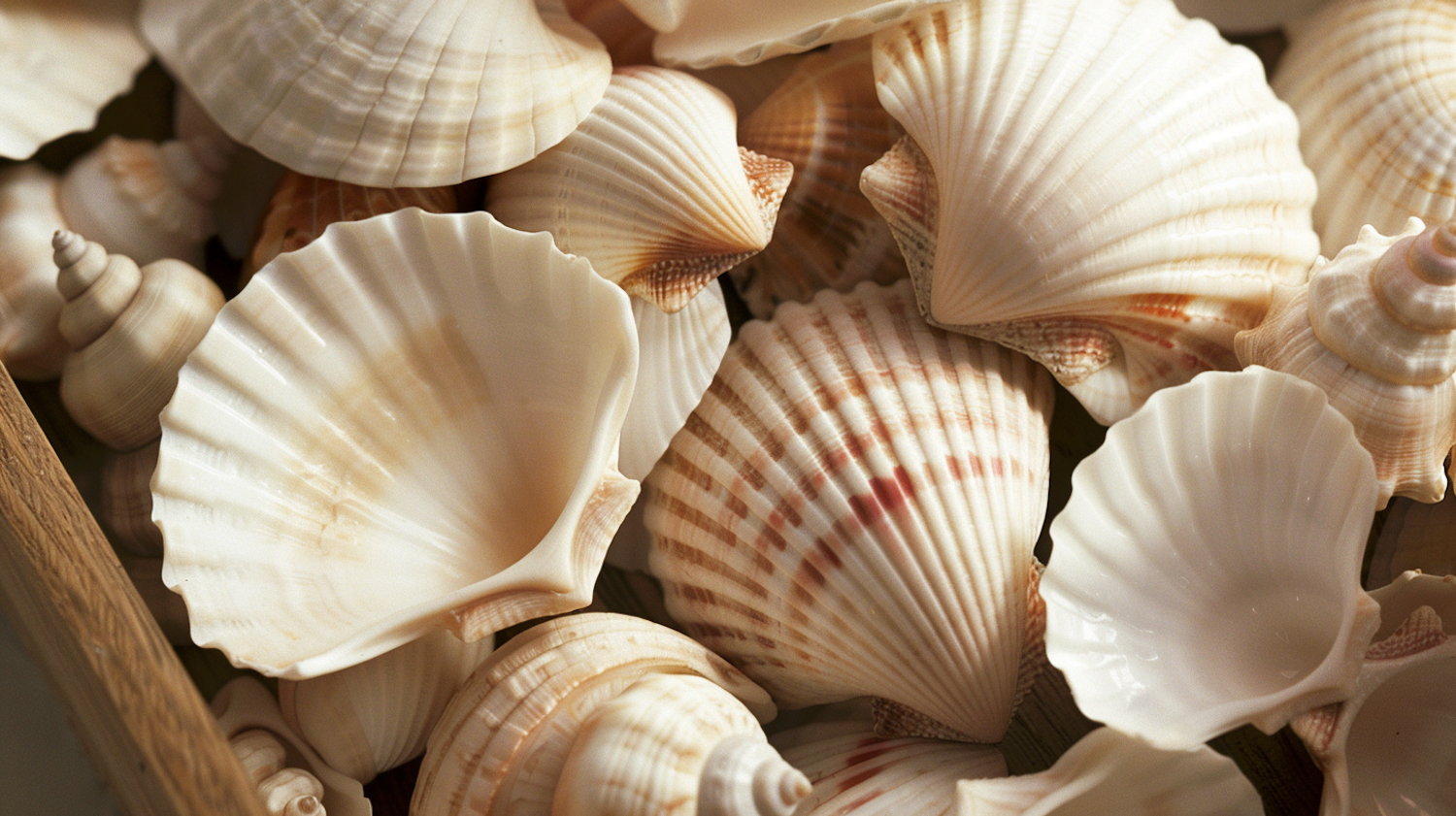 A close-up of various seashells with intricate patterns and soft colors, highlighting their natural beauty and diversity.